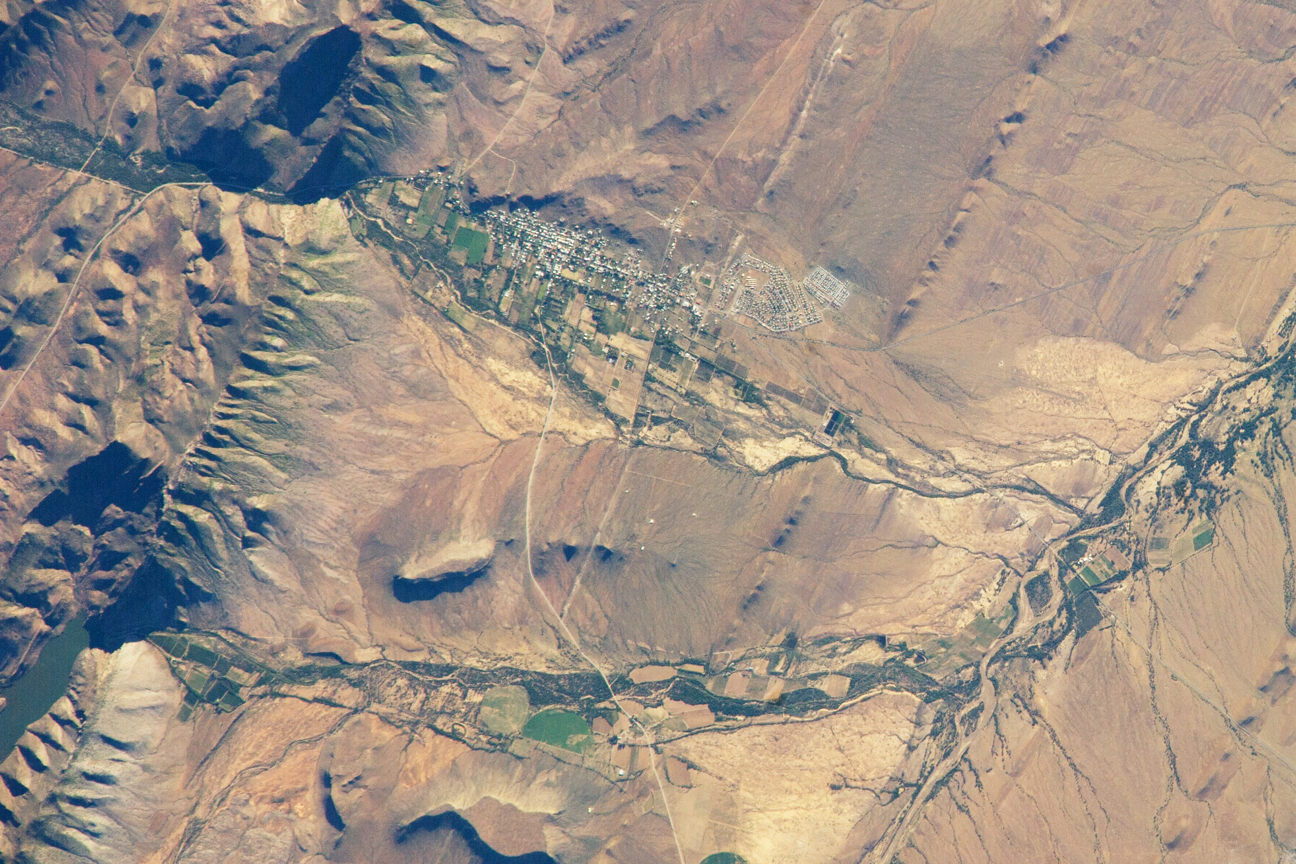 ISS crews sometimes take detailed images with an 800 millimeter lens, such as this view of the small town of Prince Albert, South Africa. The town (population about 7,000) lies about 355 kilometers (220 miles) east of Cape Town, at the foot of the mountains known as the Great Swartberg. Prince Albert, named after Queen Victoria’s husband, appears as a cluster of whitewashed buildings (image left) at the foot of the mountains, with larger dwellings nearer the steep mountain front and smaller dwellings further away.