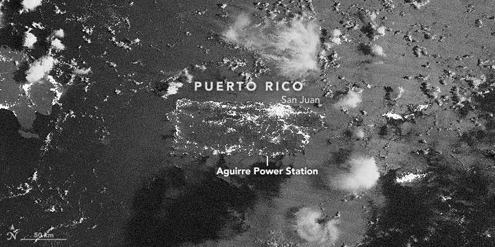 From space, the effects appeared dramatic. The Visible Infrared Imaging Radiometer Suite (VIIRS) on the Suomi NPP satellite captured these nighttime images of Puerto Rico before and after the outage. The upper image was acquired at 2:50 a.m. local time (06:50 Universal Time) on September 21, 2016; the lower image shows the island at 2:31 a.m. local time (06:31 Universal Time) on September 22, 2016.