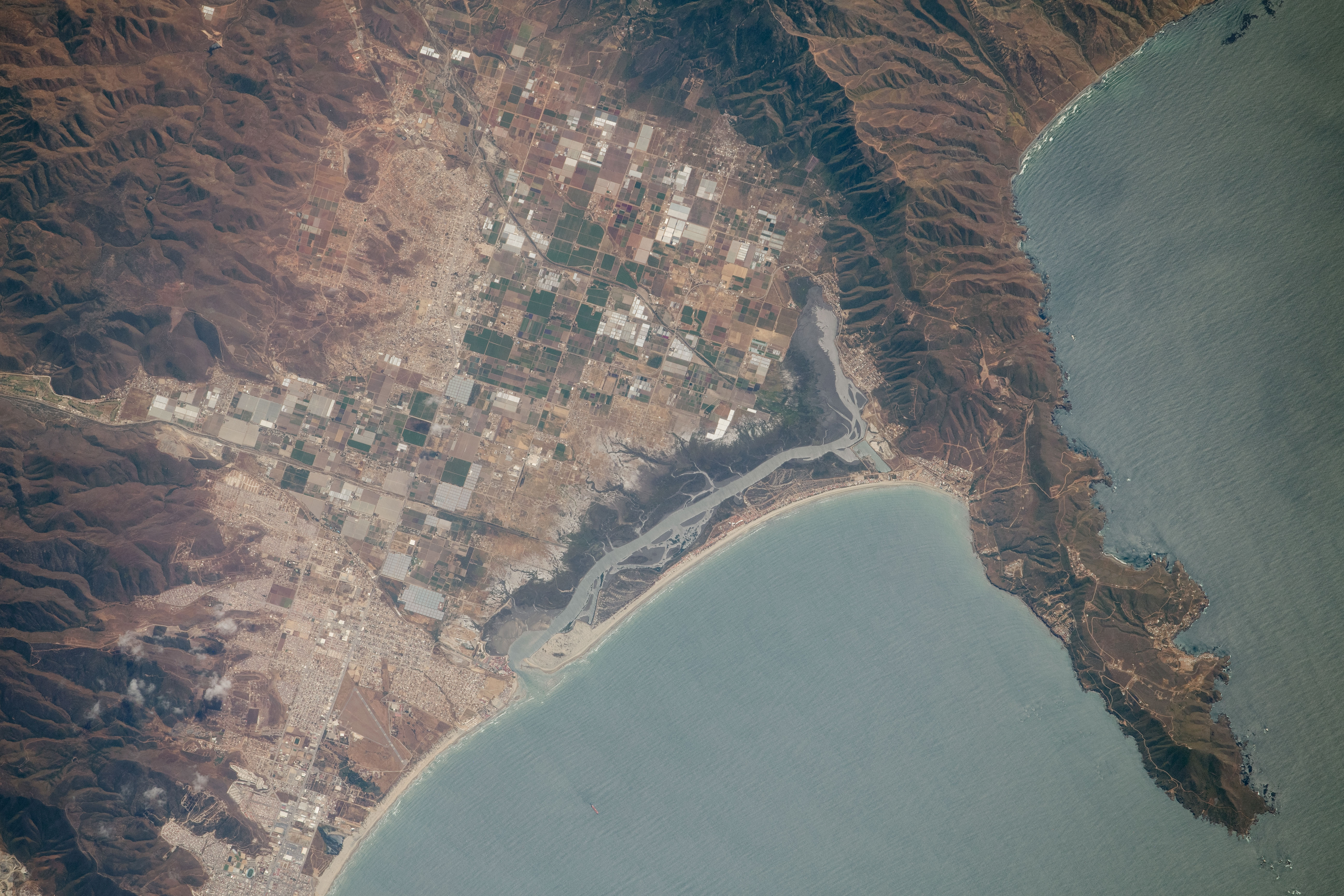 This photograph, taken by an astronaut onboard the International Space Station, captures a short section of coastline on the west coast of Baja California, Mexico. Small developed areas are interspersed among sections of farmland in a valley bounded by minor mountain ranges. The city of Ensenada, a major port and tourist destination, lies just beyond the bottom left corner of the image.