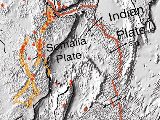 Over the base map, the Goddard team digitized active faults, rifts, subduction zones, and ocean ridges, which were then digitized. They included the rates and directions in which the plates were moving away from the mid-ocean ridges by sea-floor spreading, and showed regions of volcanic activity in the last one million years.