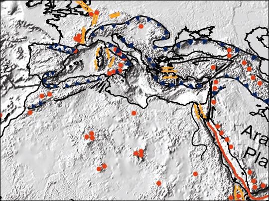 For instance, looking at the digital tectonic activity map, it isn’t hard to notice that the African Plate and the Eurasian Plate are two of the slowest moving plates in the world, and should be both moving to the east. The tectonic activity at a plate’s boundaries should depend on the plate’s movement relative to the adjacent plate. Yet, the map also shows that the Mediterranean, which forms the boundary between these two plates, has one of the highest concentrations of faults, volcanoes and earthquakes in the world in spite of the slow movement (Lowman et al., 1999).
