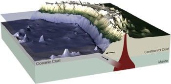 Part of the reason for the oversights, he explained, is the theory of plate tectonics. This is the theory that the Earth’s crust (oceanic and continental) is a mosaic of large rigid plates, more or less floating on the planet’s partly molten rocky mantle. Currents in the mantle constantly drive these plates, causing them to move apart, by sea-floor spreading, at mid-ocean ridges, and to collide with one another at their edges. When the plates collide, or slide past each other, earthquakes and volcanoes occur and mountains are formed.
