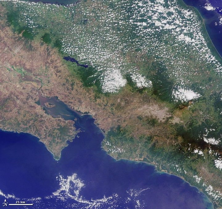 This pair of natural-color images were taken on the morning of October 22, 2011. The top picture is a high-resolution view acquired by the Advanced Land Imager (ALI) aboard the Earth Observing-1 (EO-1) satellite. A wider perspective is shown in the lower picture, acquired by the Moderate Resolution Imaging Spectroradiometer (MODIS) on Terra.