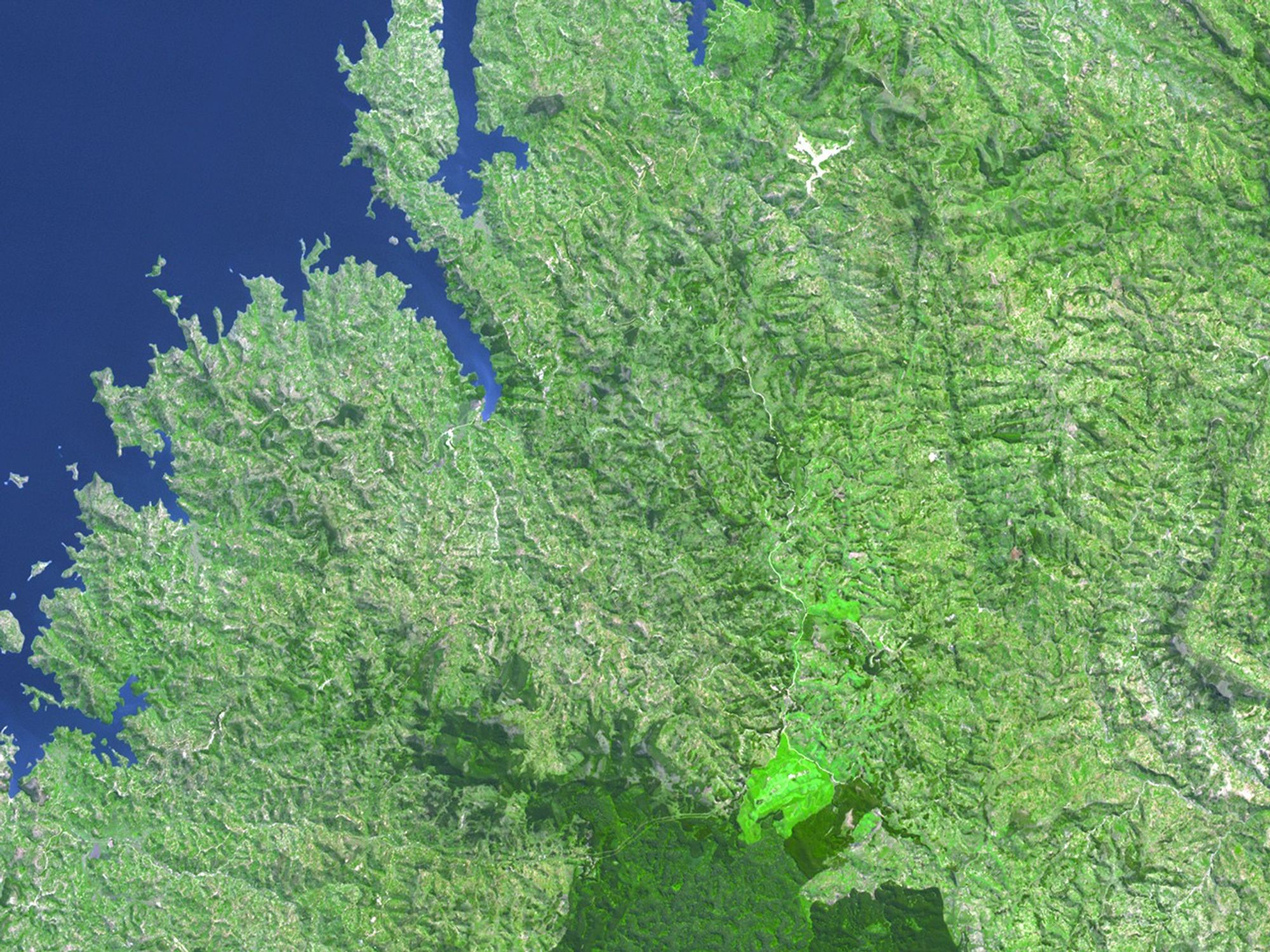 In March 2006, a trio of explorers announced they had followed the Nile to its remotest point using Global Positioning System (GPS) devices, and that the river originated in a muddy pool deep in the nearly impenetrable Nyungwe Forest in Rwanda. On June 16, 2006, the Advanced Spaceborne Thermal Emission and Reflection Radiometer (ASTER) on NASA’s Terra satellite captured this image of Nyungwe Forest and nearby Lake Kivu. In this pseudo-true-color image, blue indicates water, green indicates vegetation, and deep green indicates lush vegetation. The forest stands out from its surroundings thanks to its deeper color. The mountainous terrain near Lake Kivu shows up in this picture in sharp relief.