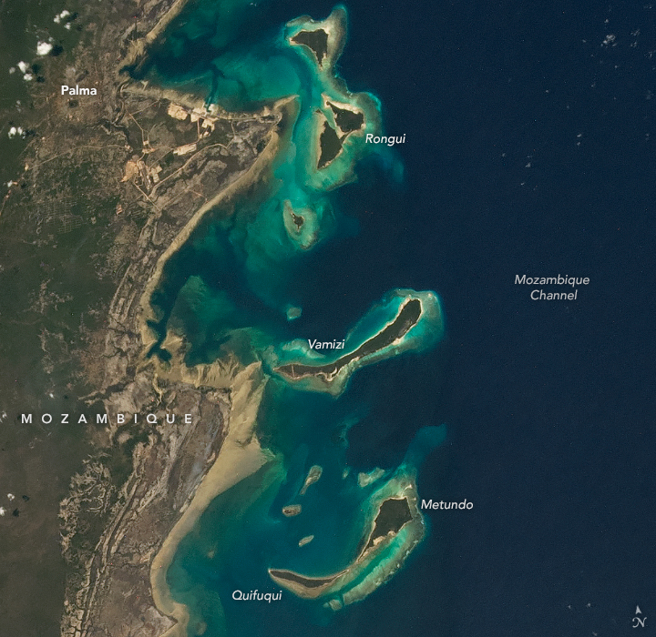 An astronaut on the International Space Station took this photograph of the northern part of the Quirimbas Islands, near the Tanzania border, on November 24, 2021. Light blue-green water highlights the shallow complex of corals, sand, and seagrass surrounding the islands.