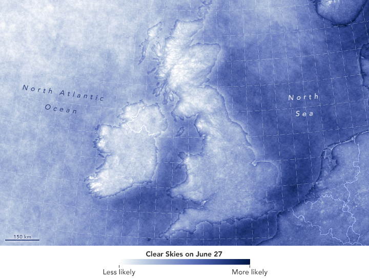 The United Kingdom and Ireland fit all of those categories, and they are among the cloudiest places on Earth. Air masses from the Arctic, southern and northern Europe, the Maritimes, and the Gulf Stream all come crashing together in this region. Yet in late June 2018, England, Ireland, Scotland, and Wales all bathed in a rare day of cloud-free skies.