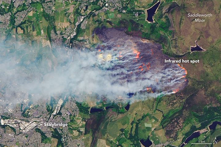 The one blemish on the image above is the thick smoke from the Saddleworth Moor fire near Stalybridge, England. Fires spread across nearly 7 square miles of moorlands. The Operational Land Imager (OLI) on Landsat 8 acquired this natural-color image of the blazes around midday on June 27.