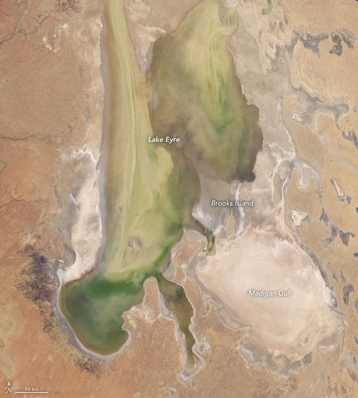 Storms dropped unusually abundant rain on northern Queensland early in summer and autumn 2019. Now that water has meandered through a long series of parched channels, watering holes, and lagoons and begun to fill the dried lake. Floodwater first began to flow into the lake in mid-March. When the Moderate Resolution Imaging Spectroradiometer (MODIS) on Terra acquired this false-color image on May 15, 2019, the lake was nearly half full.