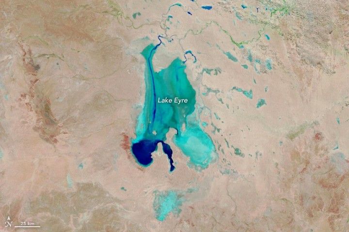 Storms dropped unusually abundant rain on northern Queensland early in summer and autumn 2019. Now that water has meandered through a long series of parched channels, watering holes, and lagoons and begun to fill the dried lake. Floodwater first began to flow into the lake in mid-March. When the Moderate Resolution Imaging Spectroradiometer (MODIS) on Terra acquired this false-color image on May 15, 2019, the lake was nearly half full.