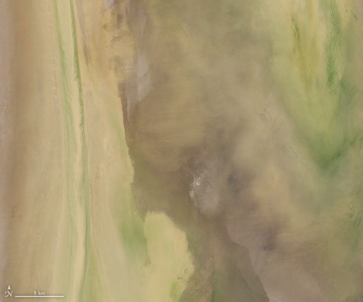 The false-color images were composed from a combination of infrared and visible light (MODIS bands 7-2-1). Water appears dark and light blue; bare ground is brown; and vegetation is bright green. This band combination makes it easier to see where water is present. Water first filled two narrow channels that run north to south; then it begun to pool in the southernmost part of Lake Eyre North. The natural-color images below, acquired by the Operational Land Imager (OLI) on Landsat 8, provide a closer view of muddy water flowing into the lake on May 5, 2019.