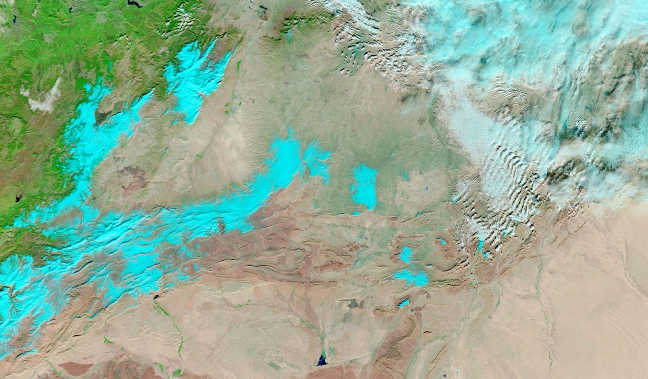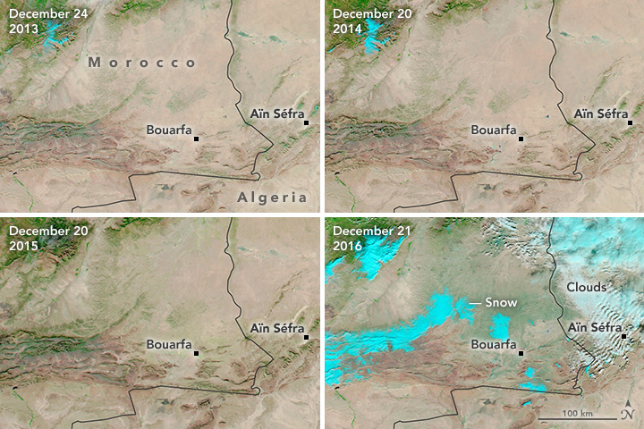 Though news accounts have been dominated by the snow in the desert city, a review of several years of satellite data suggests that snow is also unusual in this section of the Saharan Atlas range. The images below show December observations made over the past four years by the Moderate Resolution Imaging Spectroradiometer (MODIS) instruments on NASA’s Aqua and Terra satellites. The false-color images blend infrared, shortwave infrared, and visible red wavelengths, and snow shows up as a bright blue-green color.