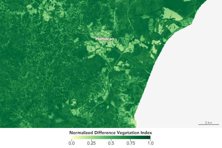 Researchers used the Normalized Difference Vegetation Index (NDVI) and other indices to map healthy, vegetated areas. Areas with extensive human settlements or with less vegetation appear yellower on the index. Indices like NDVI also detect unhealthy vegetation. By combining spectroscopy with ground observations from the University of Puerto Rico, researchers were able to pinpoint affected palm stands.