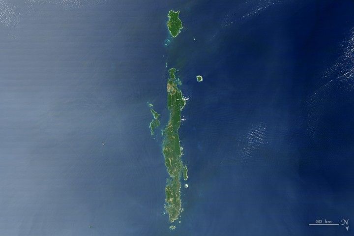 On February 10, 2007, the Moderate Resolution Imaging Spectroradiometer (MODIS) on NASA’s Terra satellite captured this image of the Andaman Islands. The thin, bright rings surrounding several of the islands are coral reefs that were lifted up by a massive earthquake near Sumatra in 2004.