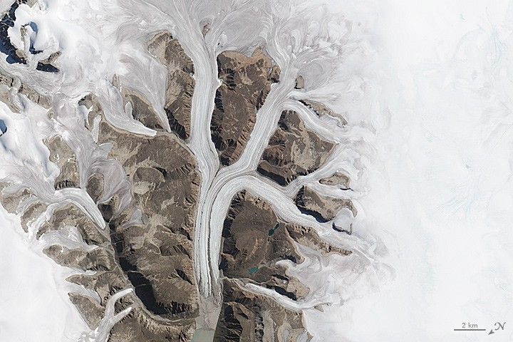 On August 14, 2015, the Operational Land Imager (OLI) on Landsat 8 captured this image of glaciers in the Tian Shan mountains in northeastern Kyrgyzstan. The trail of brown sediment in the middle of the uppermost glacier is a medial moraine, a term glaciologists use to describe sediment that accumulates in the middle of merging glaciers.
