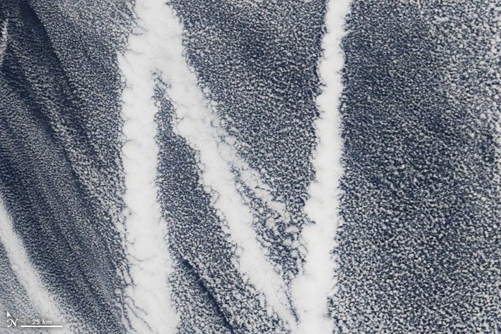 On March 4, 2009, the Moderate Resolution Imaging Spectroradiometer (MODIS) on the Terra satellite captured this image of ship tracks over the Pacific. Ship emissions contain small particles that cause the clouds to form.