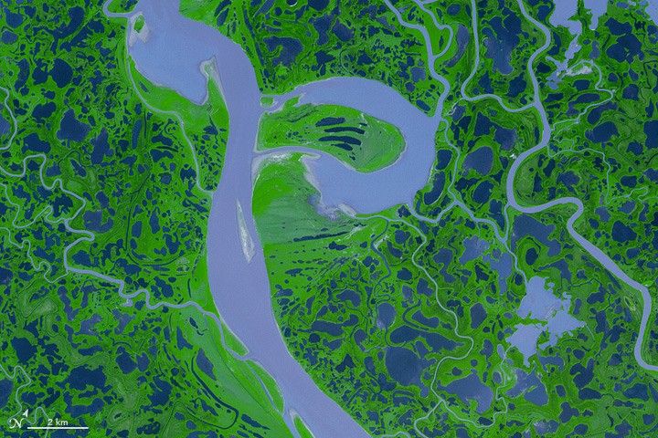 On August 4, 2005, the Advanced Spaceborne Thermal Emission and Reflection Radiometer (ASTER) sensor on the Terra satellite captured this false-color image of the Mackenzie River Delta in Canada.