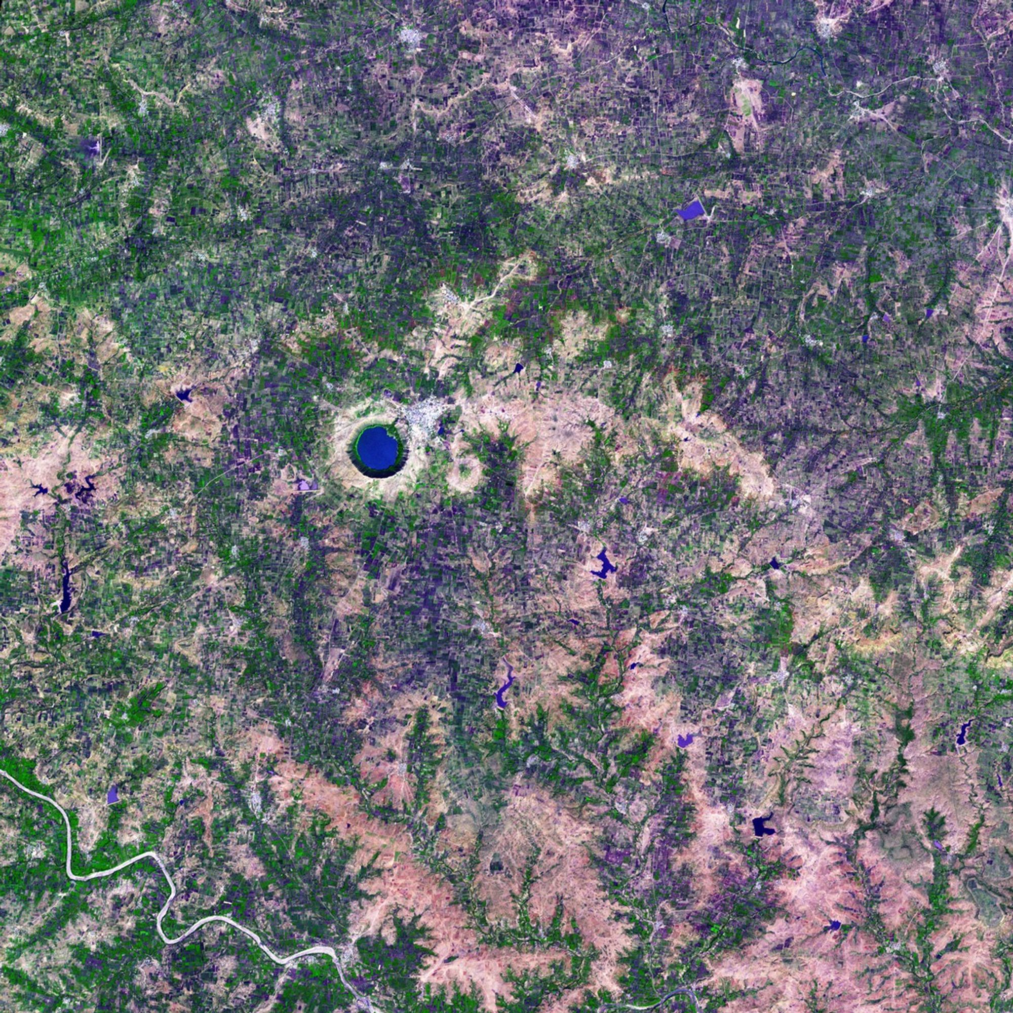 On November 29, 2004, the Advanced Spaceborne Thermal Emission and Reflection Radiometer (ASTER) on NASA’s Terra satellite acquired this image of Lonar Crater in India. Shocked quartz—minerals with an unusual structure that can only form under intense pressure—offers a clue that the lake was formed by a large meteorite.