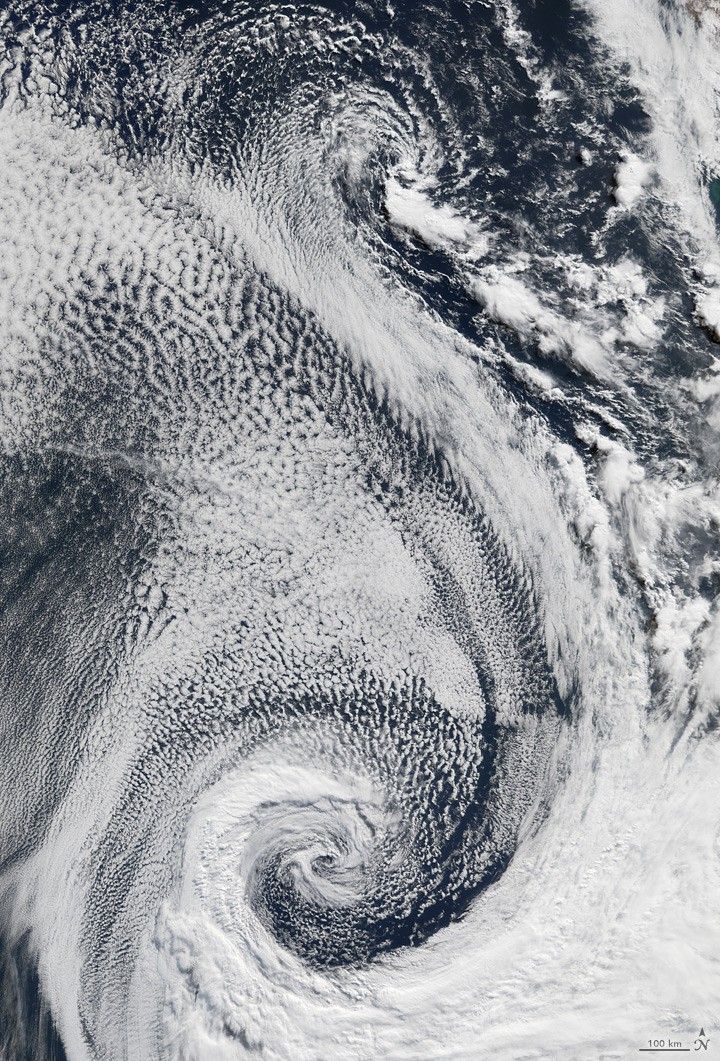 On April 29, 2009, the Moderate Resolution Imaging Spectroradiometer (MODIS) on the Terra satellite acquired this image of clouds swirling over the Atlantic Ocean.