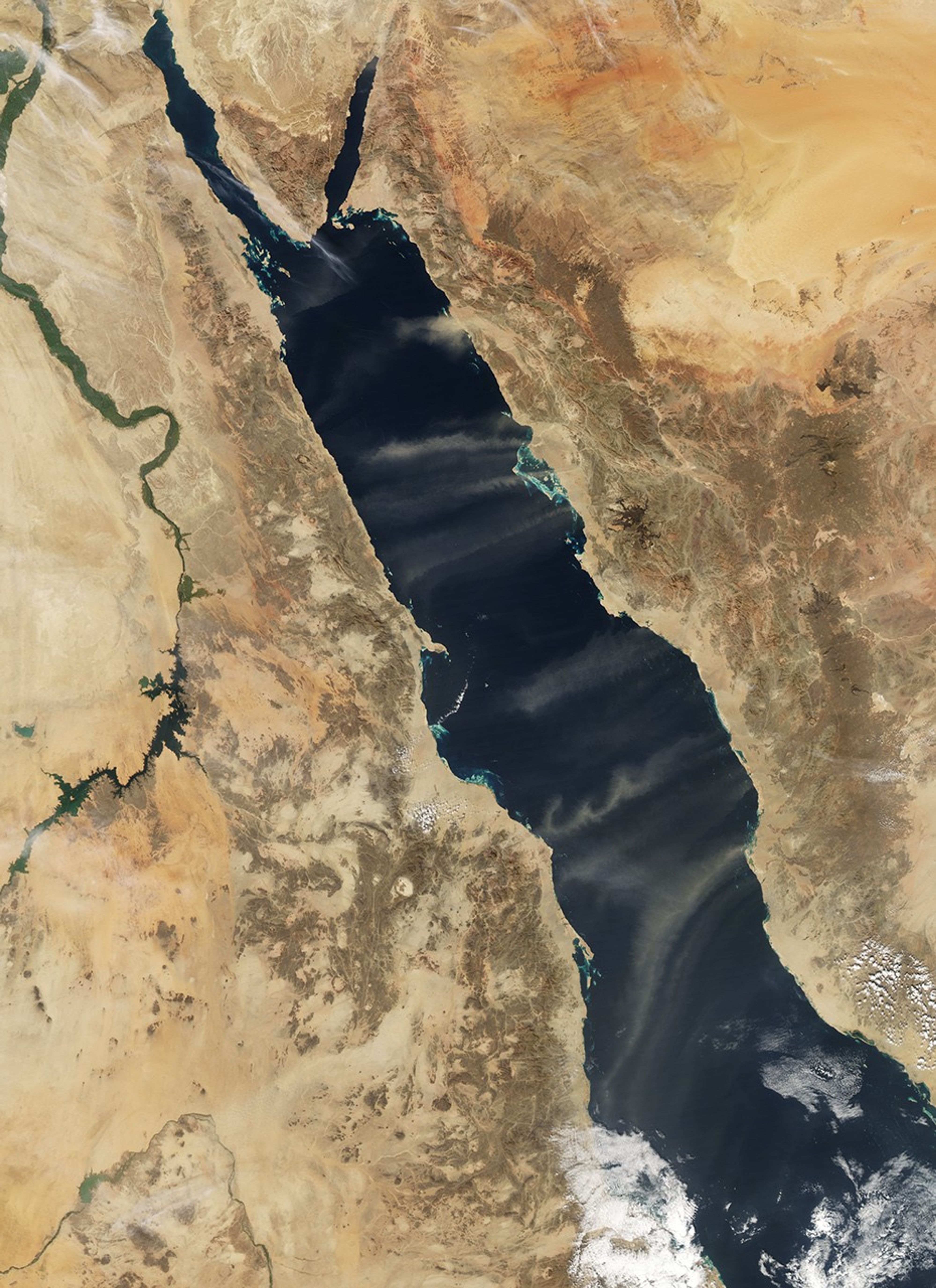 On January 13, 2009, the Moderate Resolution Imaging Spectroradiometer (MODIS) on NASA’s Terra satellite captured this image of dust blowing over the Red Sea.