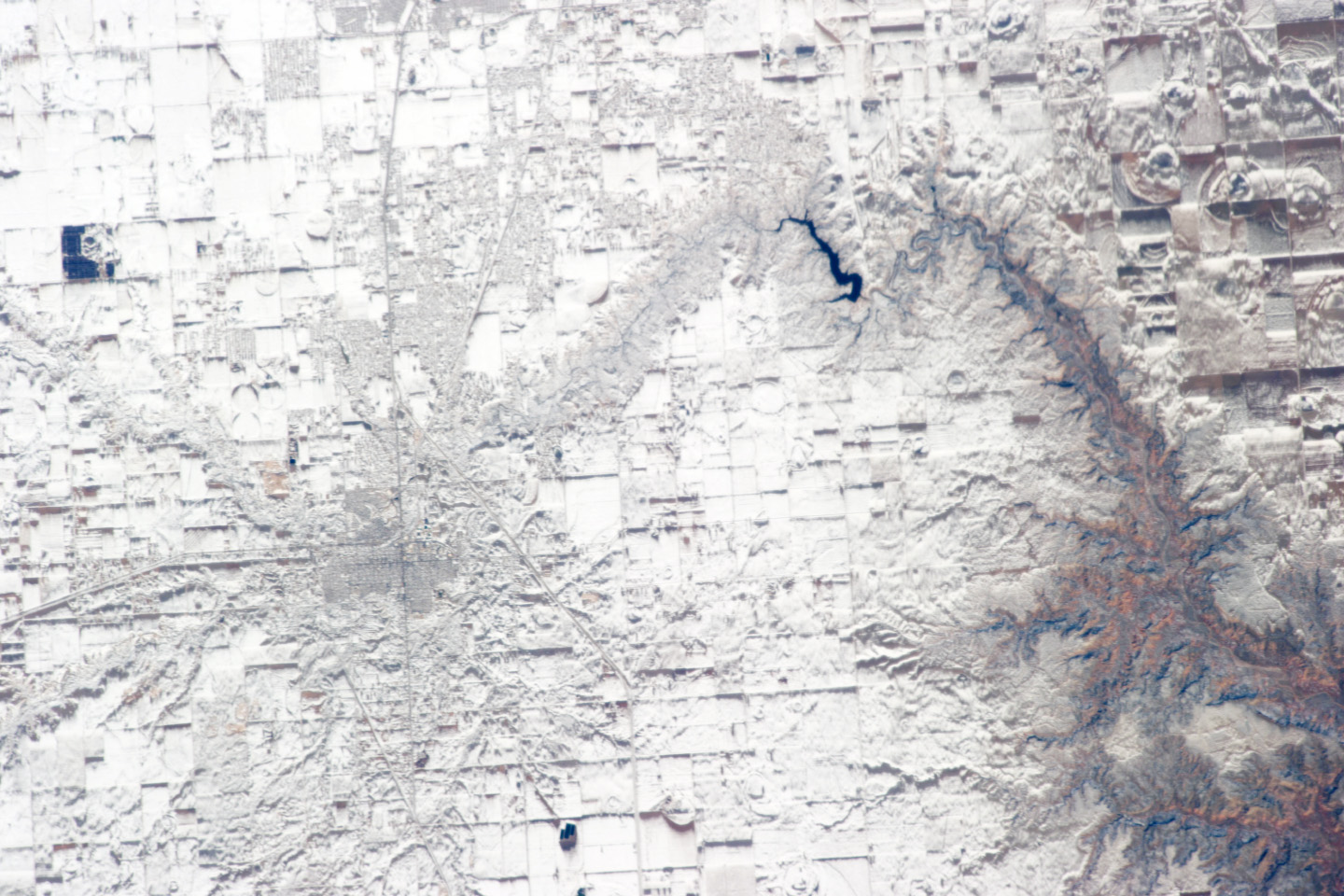 In this photo from the International Space Station, snow blankets the city of Canyon, Texas. Urban street grids and stream channels appear etched into the landscape by the snow, a result of both melting and street clearing in the urban regions and of the incised nature of stream channels in the surrounding plains. Agricultural fields are easily identified due to the even snow cover broken only by roadways between the fields. Palo Duro Canyon is largely free of snow along the Prairie Dog Town Fork of the Red River channel and at lower elevations, allowing the red sedimentary rocks of the canyon walls to be visible.
