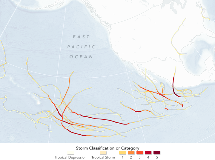 The waters of the eastern Pacific warmed significantly in 2015 with the arrival of a potent El Niño. According to the U.S. National Oceanic and Atmospheric Administration (NOAA), the region was stirred by 18 named storms and 13 hurricanes, nine of them major—the most since reliable records were started in 1971. Fueled by warm air and sea temperatures, Patricia grew rapidly into the strongest hurricane ever recorded in the Western Hemisphere, with wind gusts approaching 200 miles (320 kilometers) per hour and air pressure at 879 millibars.
