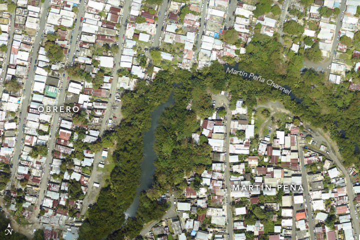 An aerial photograph above shows damaged roofs in Barrio Obrero, one of several impoverished neighborhoods clustered along the flood-prone Martín Peña Channel. Though broad mangrove swamps once lined the canal, development and pollution have pushed most of them out. The two images were acquired in April 2018 and March 2017 by a team of NASA scientists that has been studying Puerto Rico’s forests and mangroves.