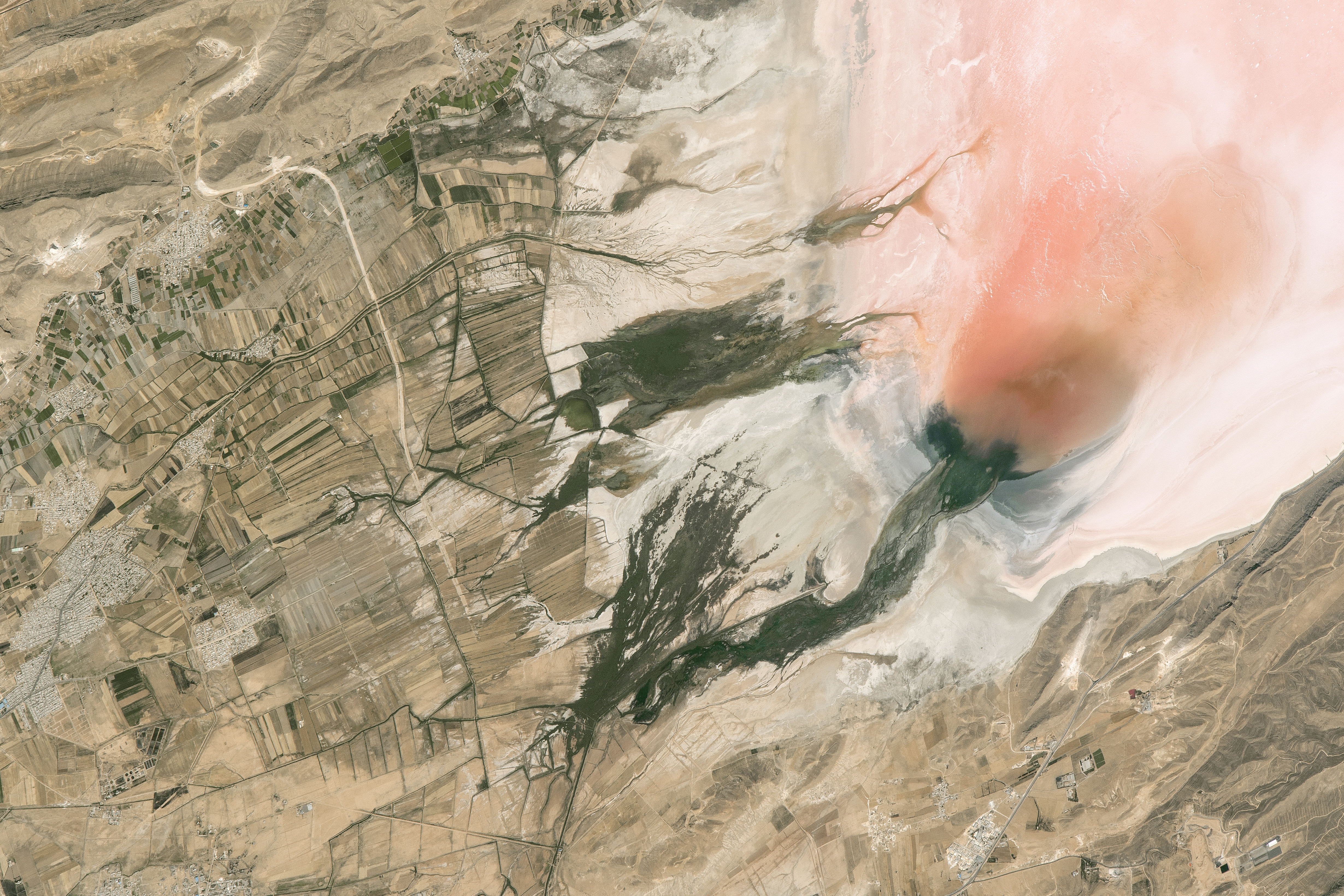 On the far left, individual buildings can be detected in two towns. These towns are outliers of the ancient city of Shiraz, which lies 25 kilometers upstream from the lake, just outside the left margin of the image. As with other closed lake basins in deserts, Lake Maharlu accumulates not only salt but also the chemical pollution washed downstream from Shiraz.