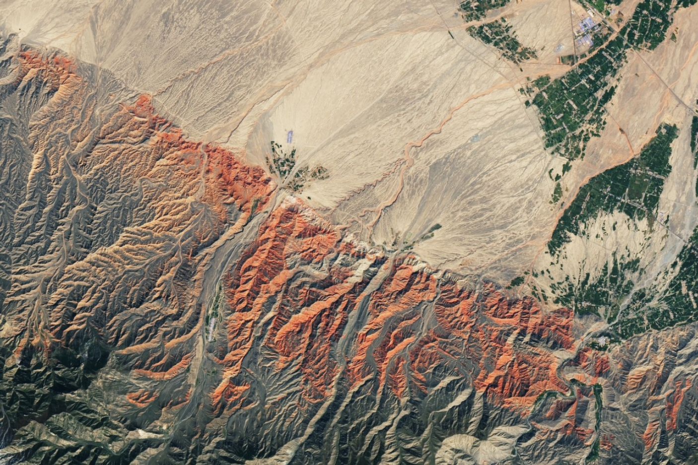 The first image shows Zhangye National Geological Park, which spans 322 square kilometers (124 square miles) of the prefecture of Zhangye. The widespread rusty color is sandstone, which was colored deep red during its formation by iron oxide. Other oxides imparted browns, yellows, and even greens to the various layers of rocks.