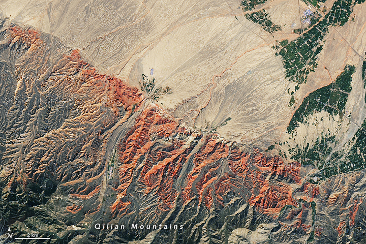 The colorful landscape around the Qilian Mountains (Qilian Shan) is visible in these images, acquired on September 17, 2020, by the Operational Land Imager (OLI) on the Landsat 8 satellite. The reds and browns of exposed sandstones and other sedimentary rocks poke out from the range’s northern foothills, where the mountains meet a flat basin to the north known as the Hexi Corridor.