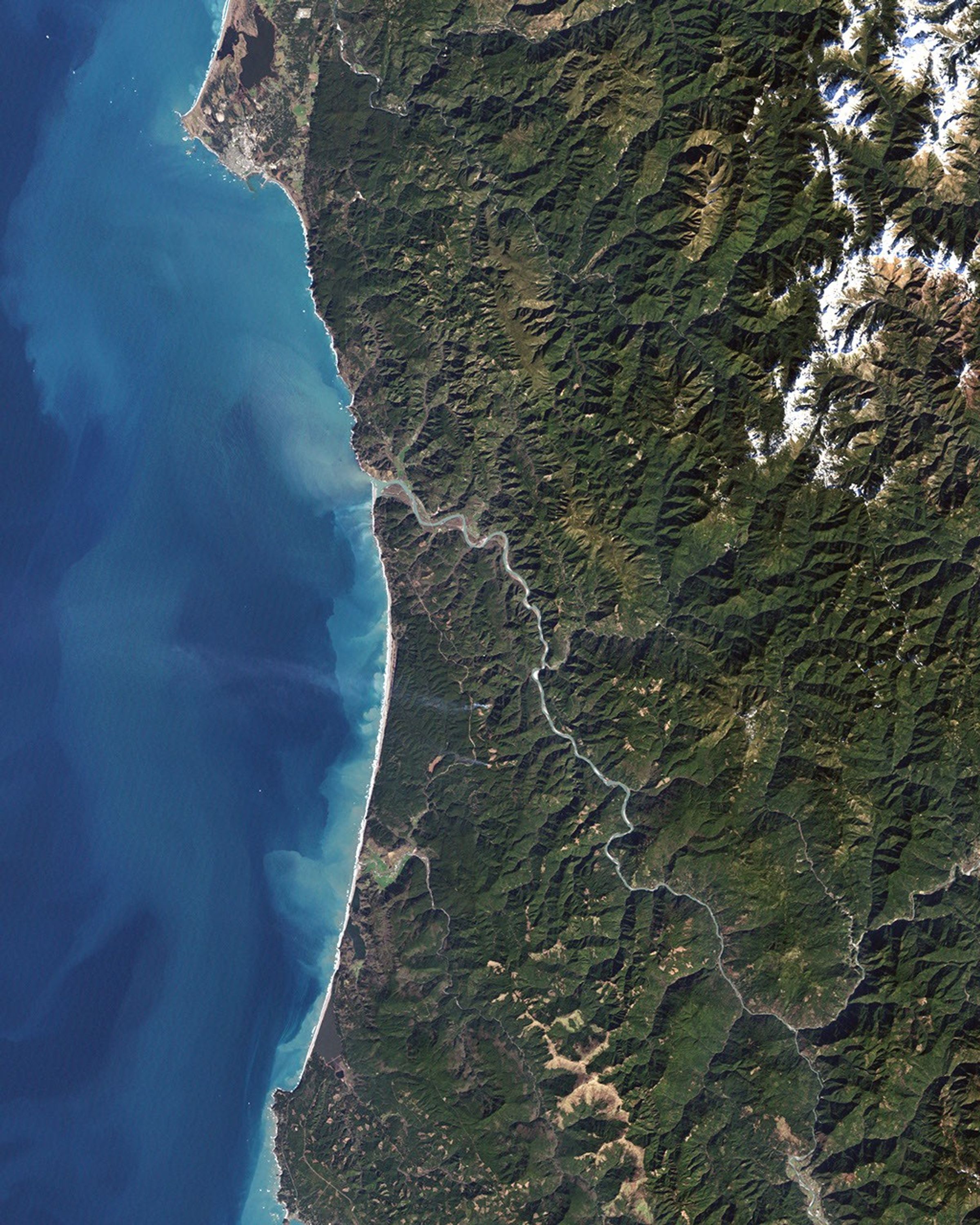 On February 6, 2003, the Enhanced Thamatic Mapper Plus on NASA’s Landsat 7 satellite captured this true-color image of the southern end of Redwood National Park. (A thin coastal corridor connects the northern and southern ends of the park system.) A white border delineates the park boundaries, working around a river near the Orick Horse Trail, close to the coast. Along the coast, sandy beaches appear off-white, and sediments form swirls of pale blue in the darker blue sea. Inland, the park is dominated by green vegetation, with isolated patches of gray-beige rock.