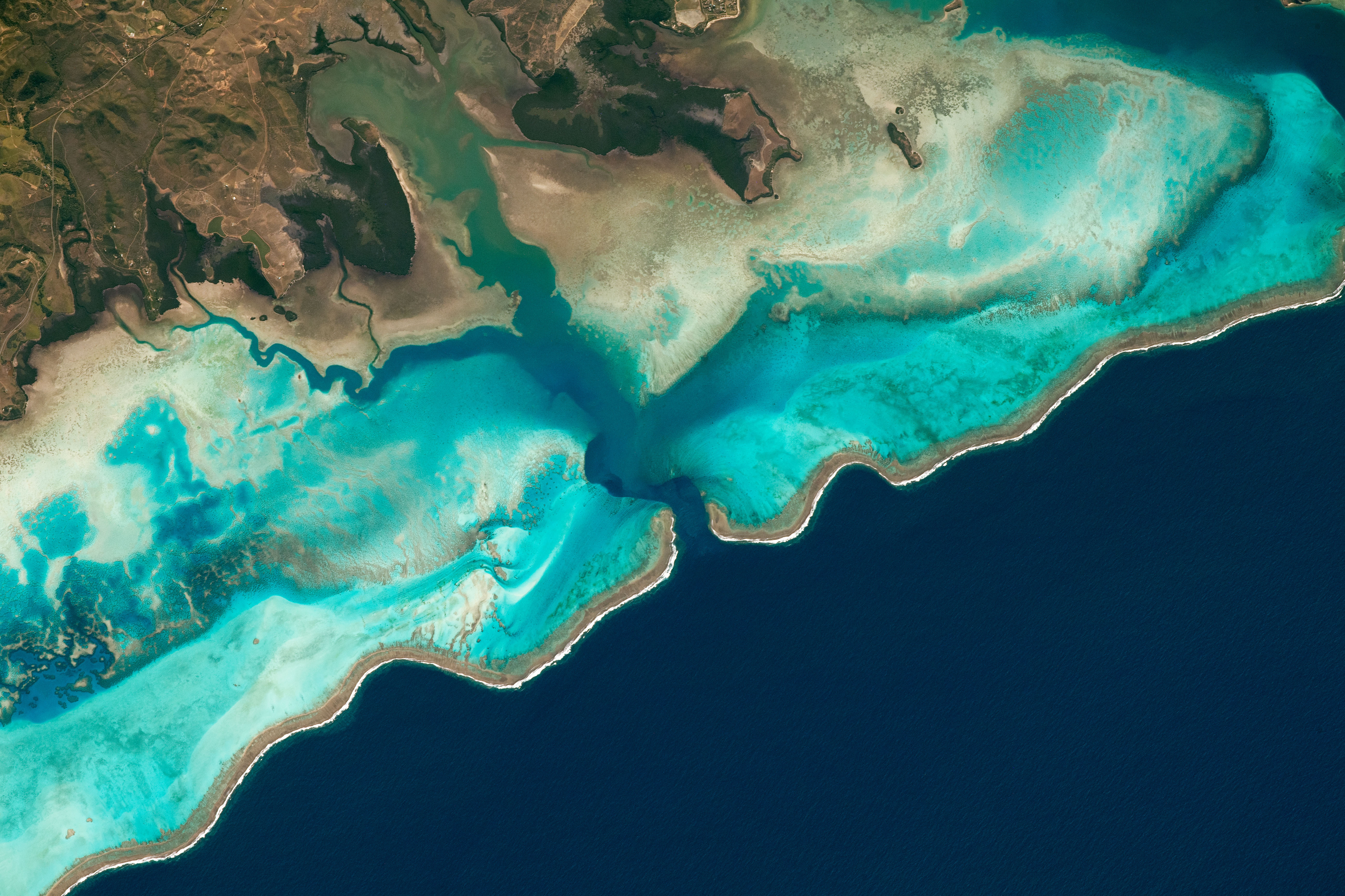 While orbiting over the southwestern Pacific Ocean, an astronaut onboard the International Space Station (ISS) photographed this fringing coral reef on the south coast of New Caledonia. The reef separates the light blue shallows of the lagoon from the darker, deeper Pacific Ocean. Tan hues tinge the lagoon where sediment flows in from uplands to the north-northeast.