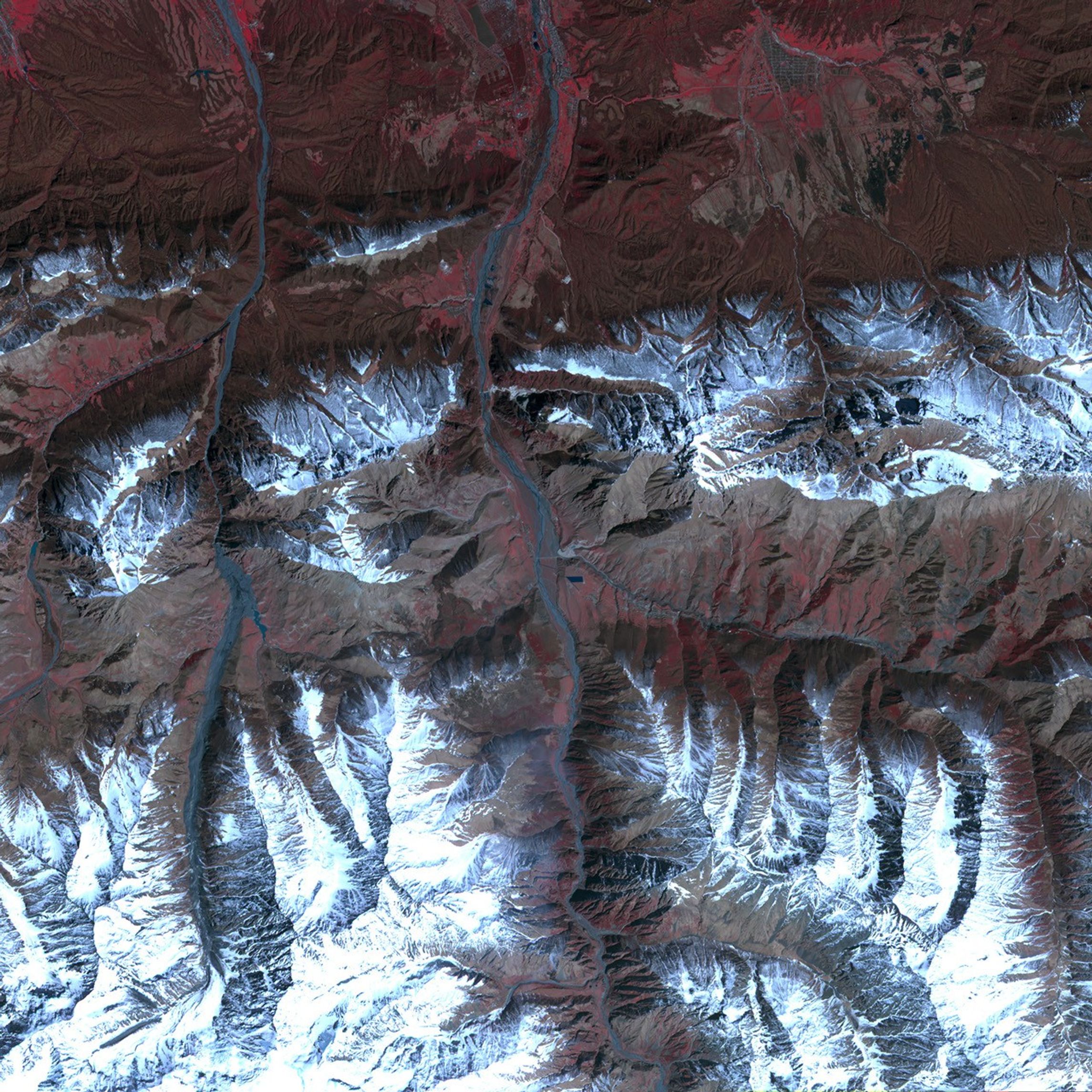 The evidence of this devastating event was still visible from satellite a year and a half later. This image was captured by the Advanced Spaceborne Thermal Emission and Reflection Radiometer (ASTER) on NASA’s Terra satellite on April 9, 2004. The Genaldon River Valley (center) appears to have been lined in slate where the avalanche left an 18-kilometer (11-mile) trail of ice, rock, and pulverized stone along the slopes.