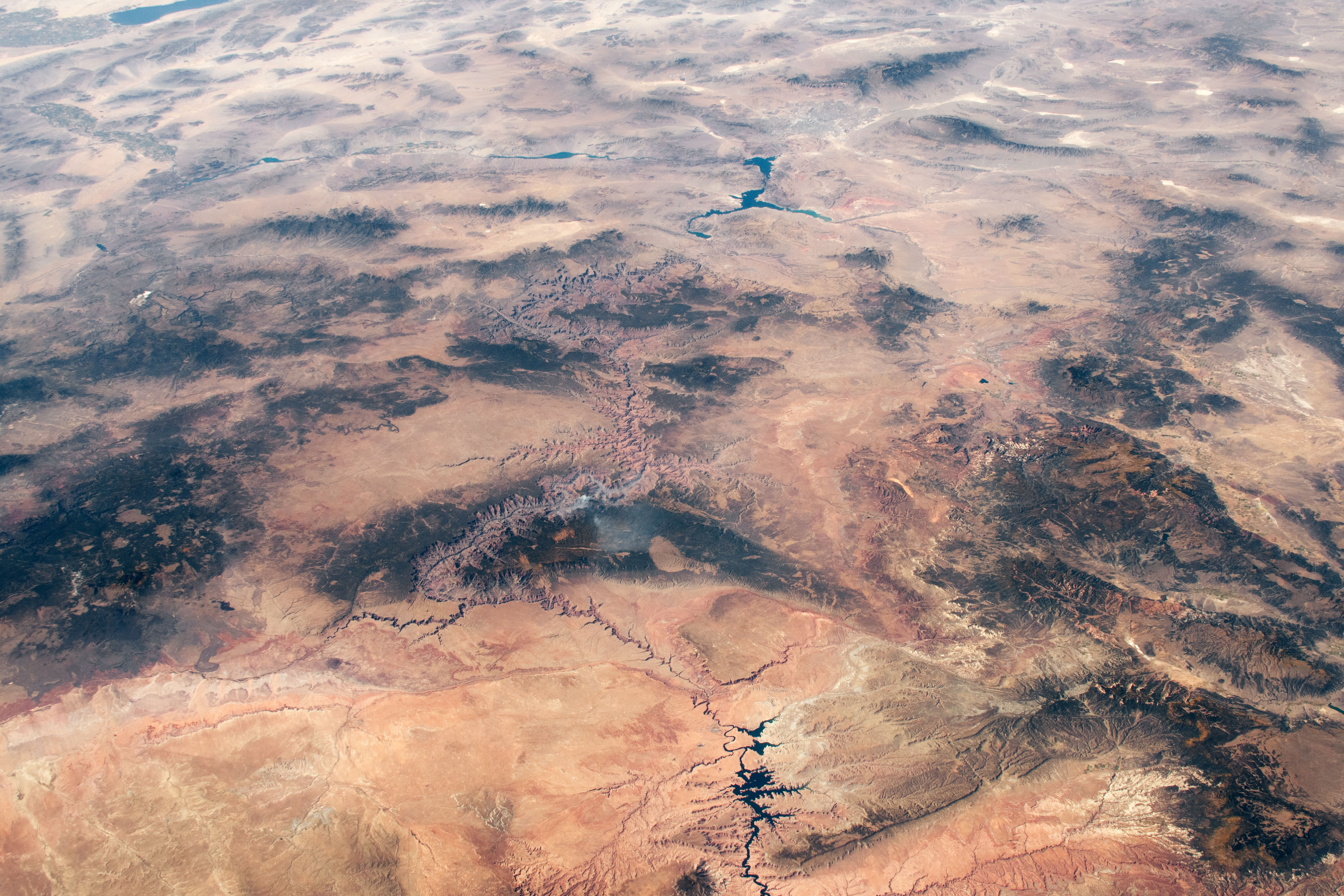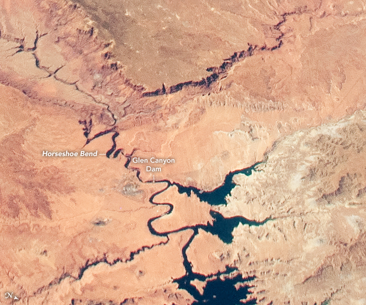 While natural forces like erosion have been reshaping the landscape for thousands of years, humans have made their mark in the past hundred years. The largest bodies of water in these images are the artificial reservoirs at Lake Powell and Lake Mead, which were formed by the Glen Canyon and Hoover dams, respectively. The lakes are the two largest artificial reservoirs in the United States, providing hydroelectric power and water for about 40 million people and 5.5 million acres of farmland across the U.S. West and Mexico.