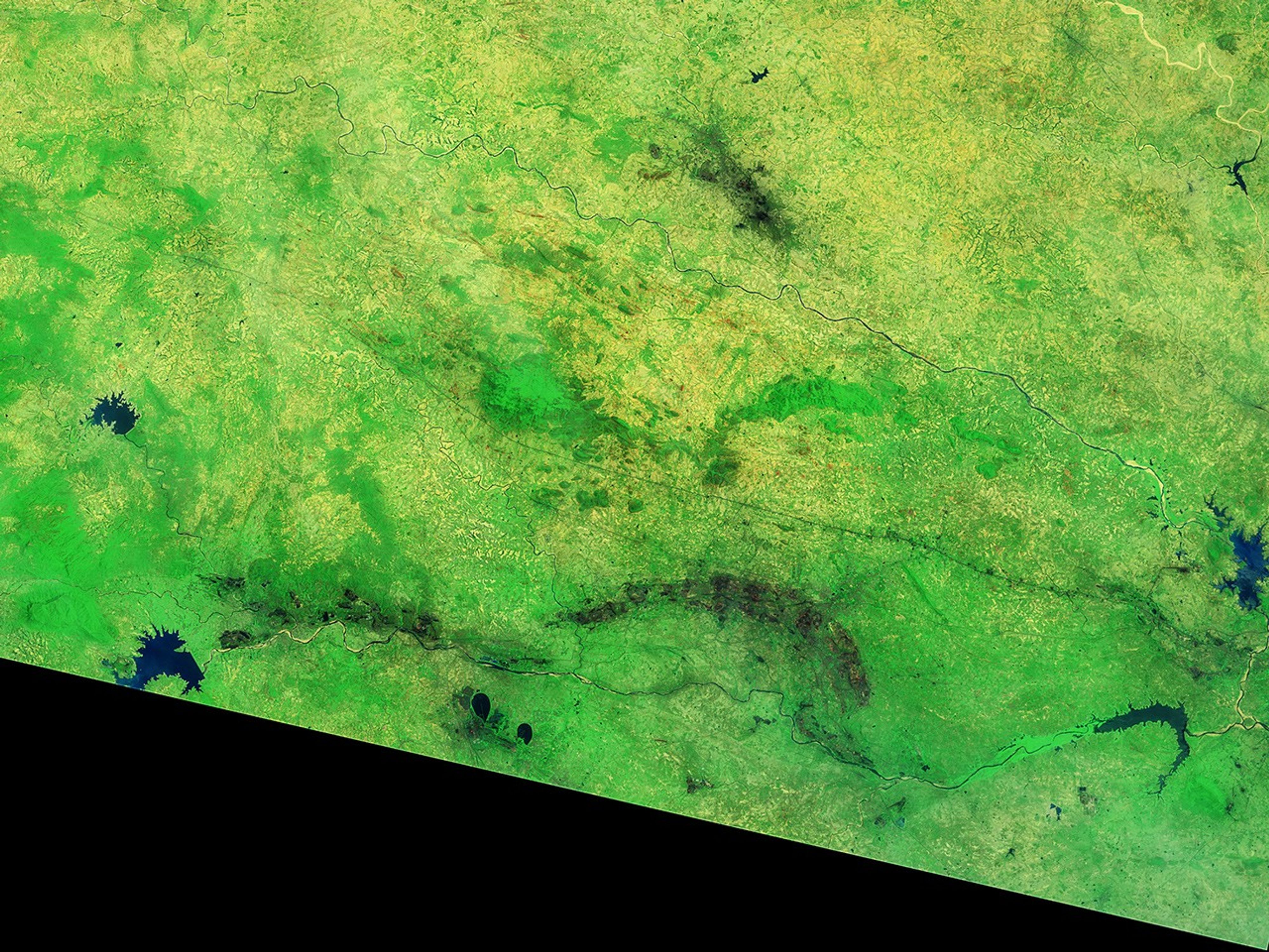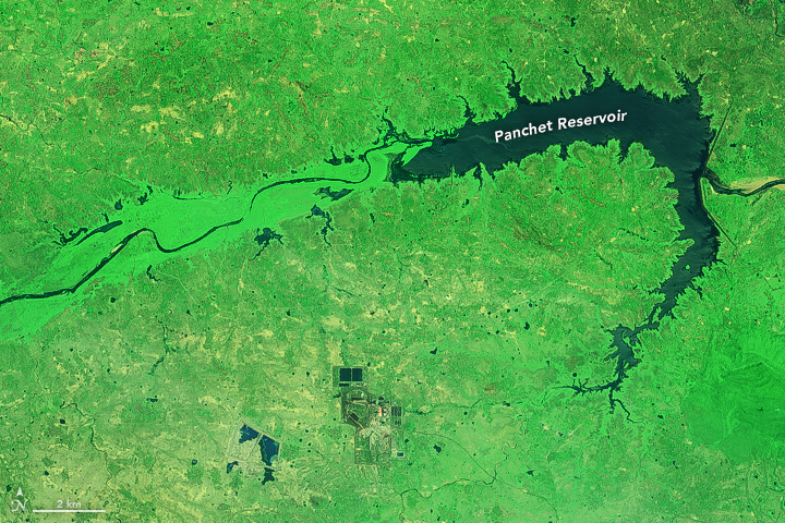 Of all of India’s reservoirs, Panchet Hill in Jharkhand was among the lowest compared to the 10-year average. In the first week of June 2016, the reservoir stood at 4 percent of capacity; the average for June is 40 percent. The Operational Land Imager (OLI) on the Landsat 8 satellite captured images of the reservoir on June 10, 2015 (top) and June 12, 2016 (second).