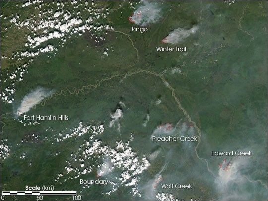 NASA image by Jesse Allen, Earth Observatory; based on data provided by the ASTER Science Team. Glacier retreat boundaries courtesy the Land Processes Distributed Active Archive Center.