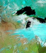 Snow and ice blanket almost the entire region on February 28. Rivers, hills, and cities interrupt the otherwise uniform sea of blue-green, and some vegetation peeks through the snow in Wisconsin. By March 28, snow has mostly retreated to the north side of the Minnesota and Mississippi Rivers, both of which are much more prominent than they were a month earlier. By April 6, snow and ice have nearly left the scene. Some ice lingers on lakes in the northwest, and a stretch of ice remains on the Minnesota River northwest of Montevideo. Since late March, however, higher water is apparent along the Mississippi River. The river appears swollen near St. Paul, and is higher near La Crosse.