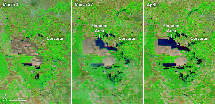 These images show a wider view of the Tulare lakebed. They were acquired by the Moderate Resolution Imaging Spectroradiometer (MODIS) on NASA’s Aqua satellite and show the progression of flooding between March 2 and April 1. Two successive atmospheric rivers hit California in March 2023, contributing to flooding along the San Joaquin River and a breach of the Los Angeles Aqueduct.