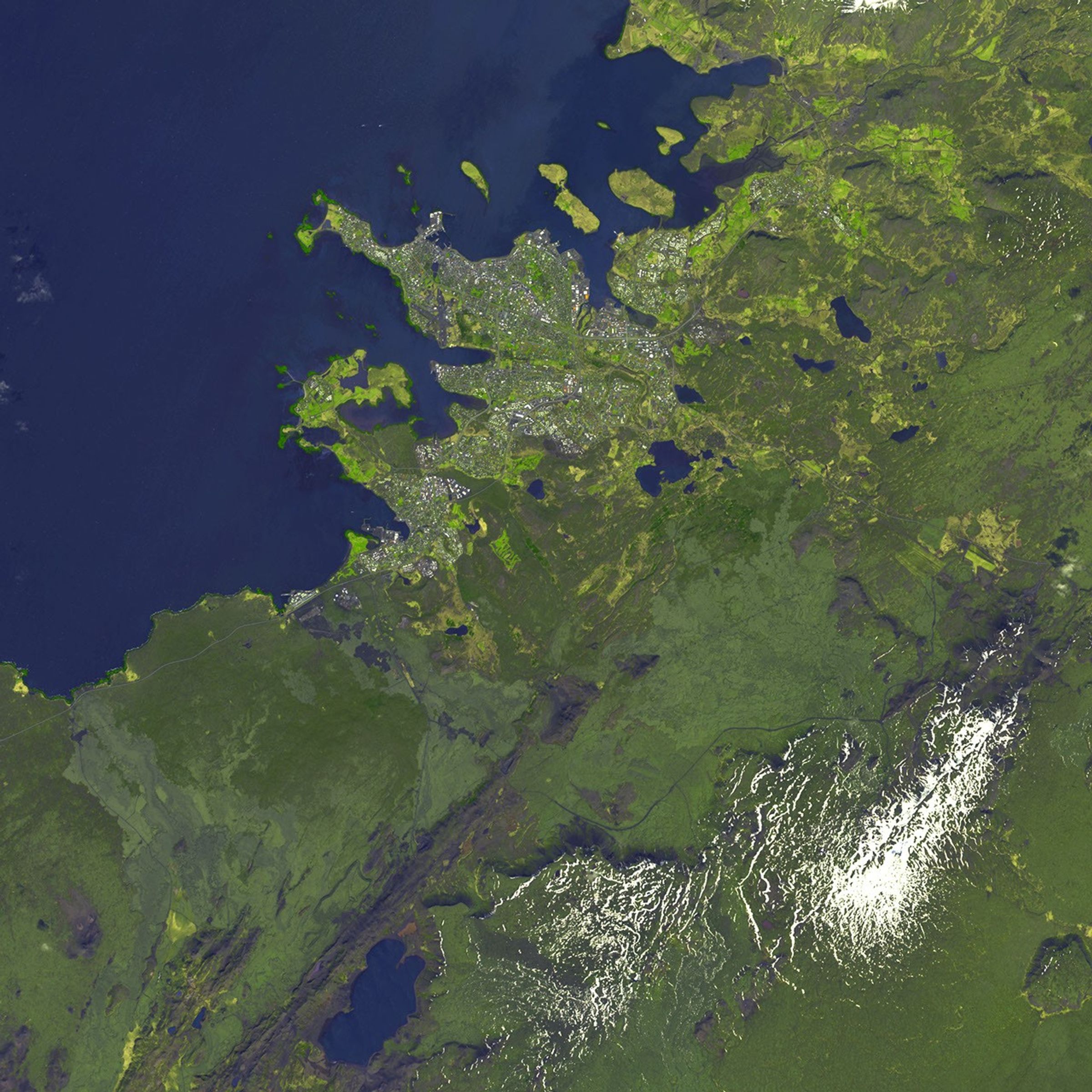 On May 11, 2002, the Advanced Spaceborne Thermal Emission and Reflection Radiometer (ASTER) sensor on NASA’s Terra satellite captured this image of Reykjavik and its surroundings. Resting on a peninsula, the capital city stands out from the nearby landscape thanks to its straight lines, sharp angles, and mostly gray hues. Outside of the city, vegetation appears in various shades of green. As Iceland is geologically young and its climate is cold, sizable plants are rare. Less than one-fourth of Iceland’s land surface has continuous plant cover, and the plants consist mostly of low-growing shrubs. Little of Iceland’s land surface is cultivated, but such areas appear in bright green in and around Reykjavik. A clear example of cultivated land is the meandering, wormlike area south of the city—a golf course.