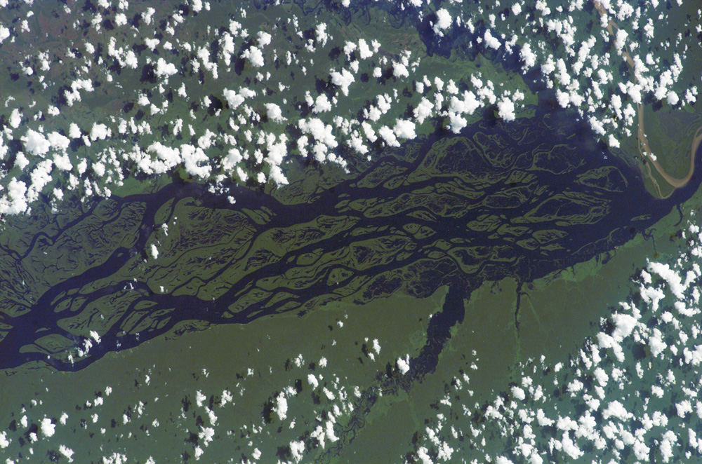 The wide, multi-island zone in the Rio Negro (Black River) shown in this astronaut photograph from September 2, 2006, is one of two, long “archipelagoes” upstream of the city of Manaus (not shown) in central Amazonia. Sixty kilometers of the total 120-kilemeter length of this archipelago appear in this image. The direction of the river’s flow is east-southeast, which is from left to right in this image; the river is about 20 kilometers wide near the right side of the image. On the day the image was taken, air temperatures over the cooler river water of the archipelago were just low enough to prevent cloud formation. Over the neighboring rainforest, temperatures were warm enough to produce small convection-related clouds, known to pilots as “popcorn” cumulus. Several zones of disturbed forest, represented by lighter green zones along the river banks are also visible.
