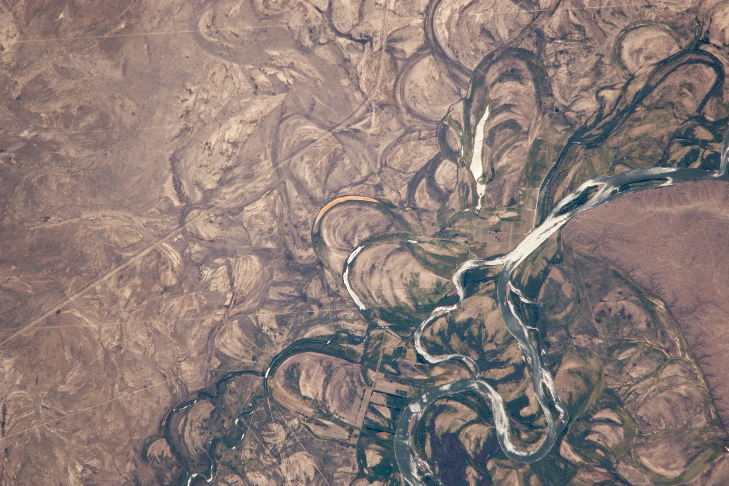 The Rio Negro flows generally southeast from the Andes Mountains to the Atlantic Ocean. Its floodplain supports the biggest pear- and apple-growing region of Argentina. Rectangular farm boundaries can be seen at bottom center in the image. The river also hosts the world’s longest kayak regatta, which lasts six days. During the 1800s, the river was also the demarcation line between farmlands of European settlers and territory controlled by indigenous people.