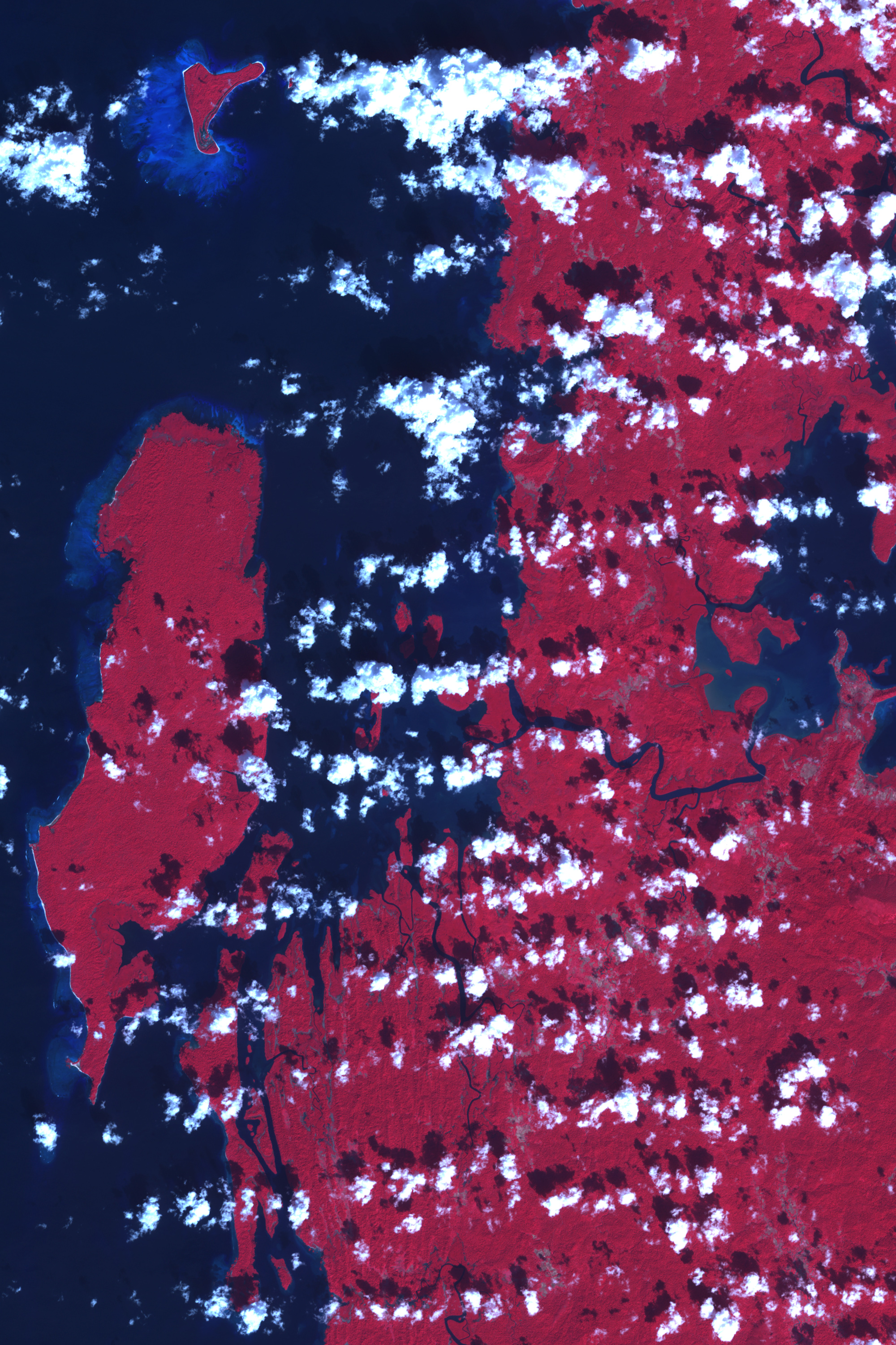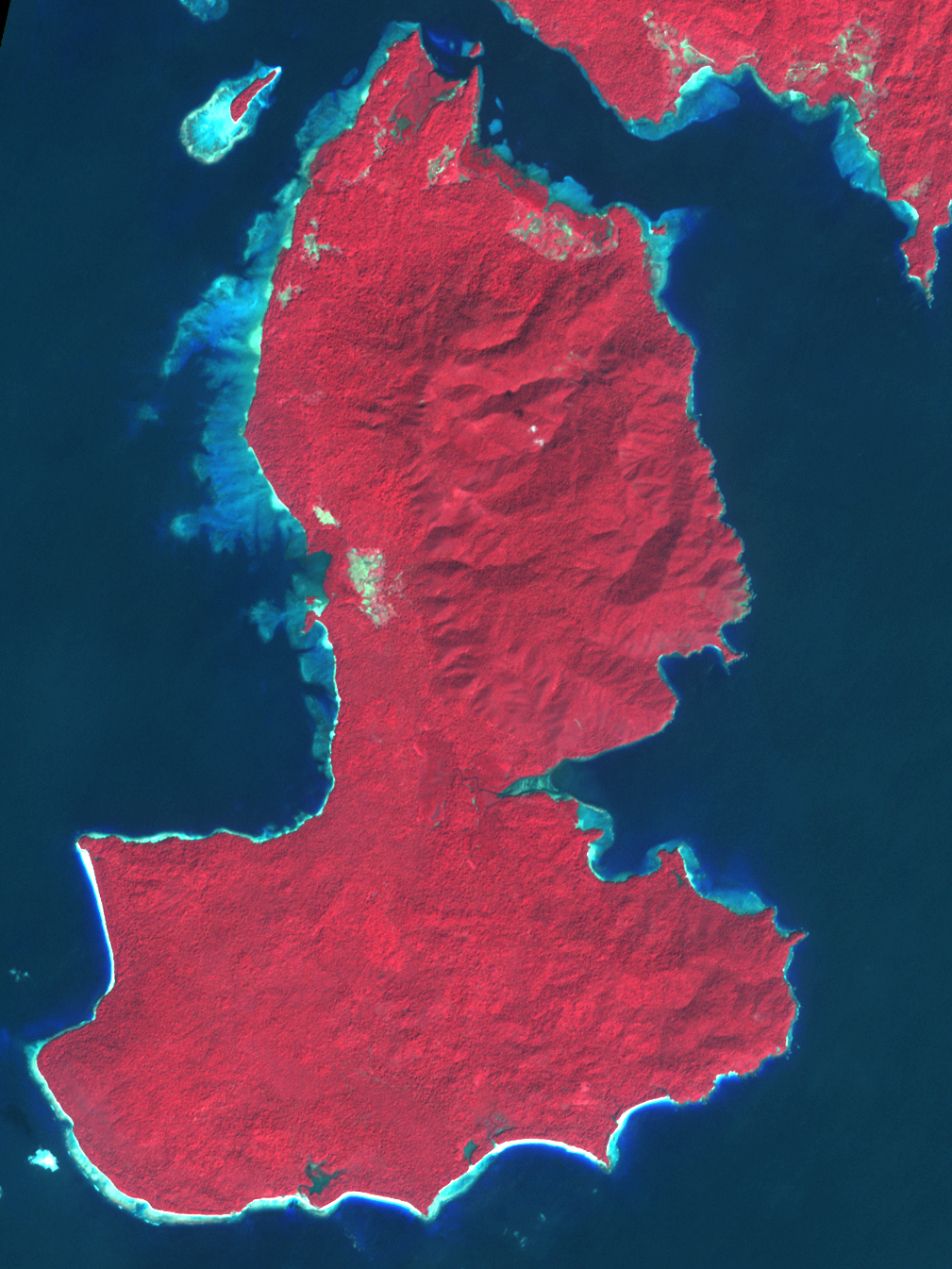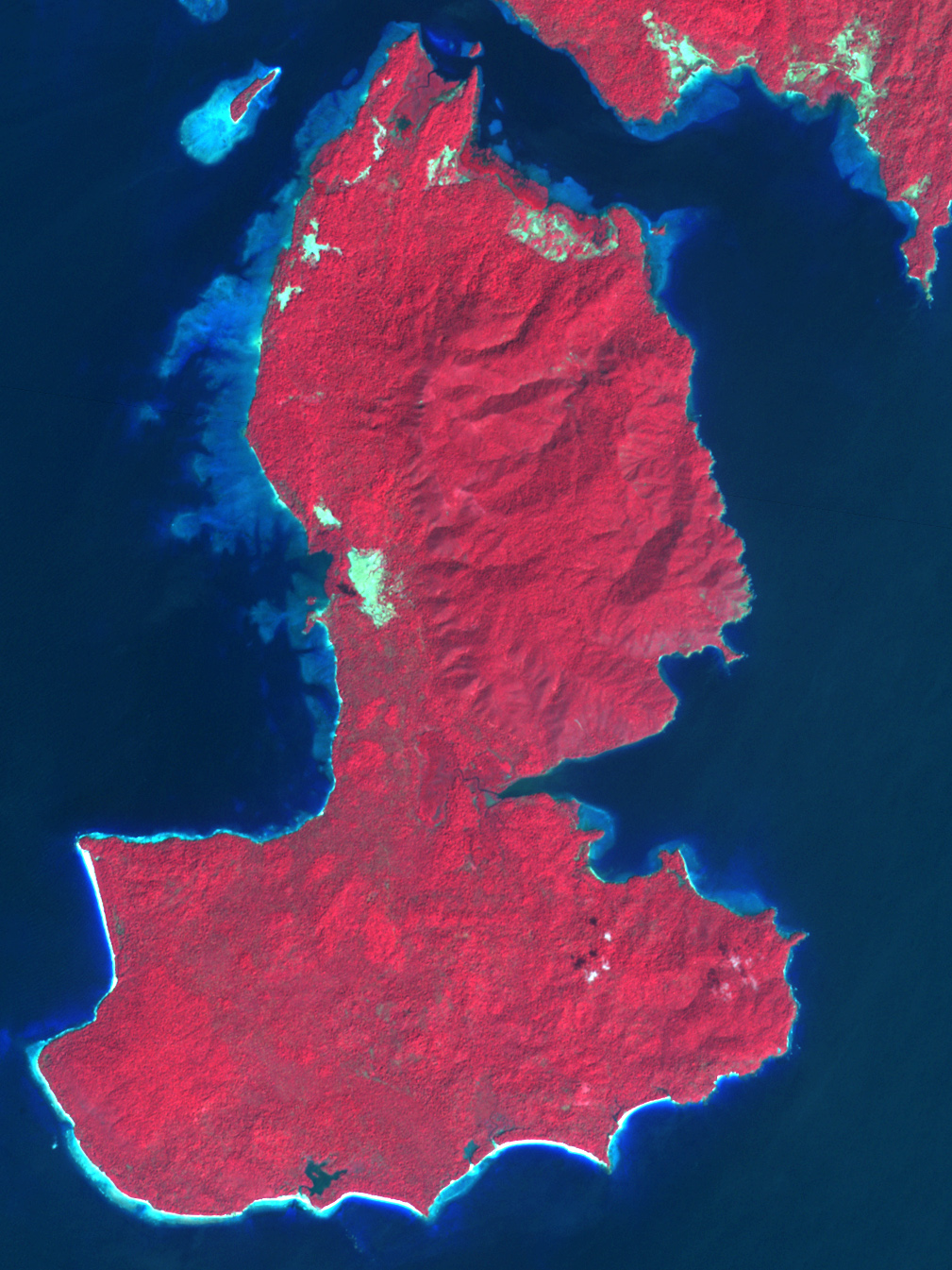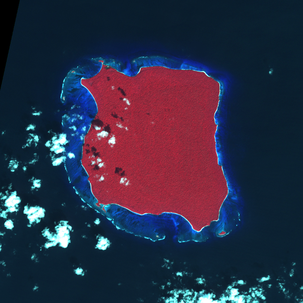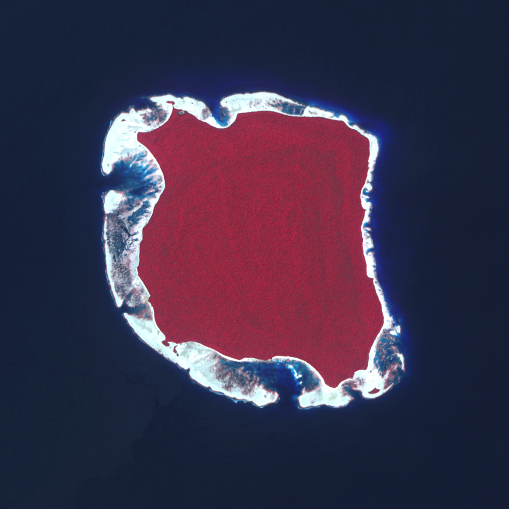 Colleagues in the Caltech Division of Geological and Planetary Sciences steered him toward remote-sensing scientist Michael Abrams of NASA’s Jet Propulsion Laboratory. Abrams is the lead scientist for a NASA sensor called ASTER, short for Advanced Spaceborne Thermal Emission and Reflection Radiometer. ASTER sees both visible and infrared wavelengths of light. In the ASTER images Meltzner saw, the ocean appeared deep blue. A submerged reef made a bright blue glow in the water. An exposed reef or beach appeared nearly white.