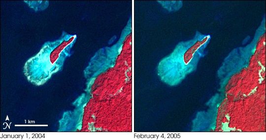 As it turned out, the uncertainties in the seismic data and the region’s skimpy GPS network opened the door for some unconventional thinking about how to study earthquakes. When Meltzner returned to school in early January 2005, people were trickling back to campus after winter break. Scientists in his department started to give presentations about the quake, and some of them showed satellite imagery of affected areas. In addition to coastlines stripped of vegetation and strewn with debris from the tsunamis, some images hinted at dramatic changes in the elevation of reefs and islands.