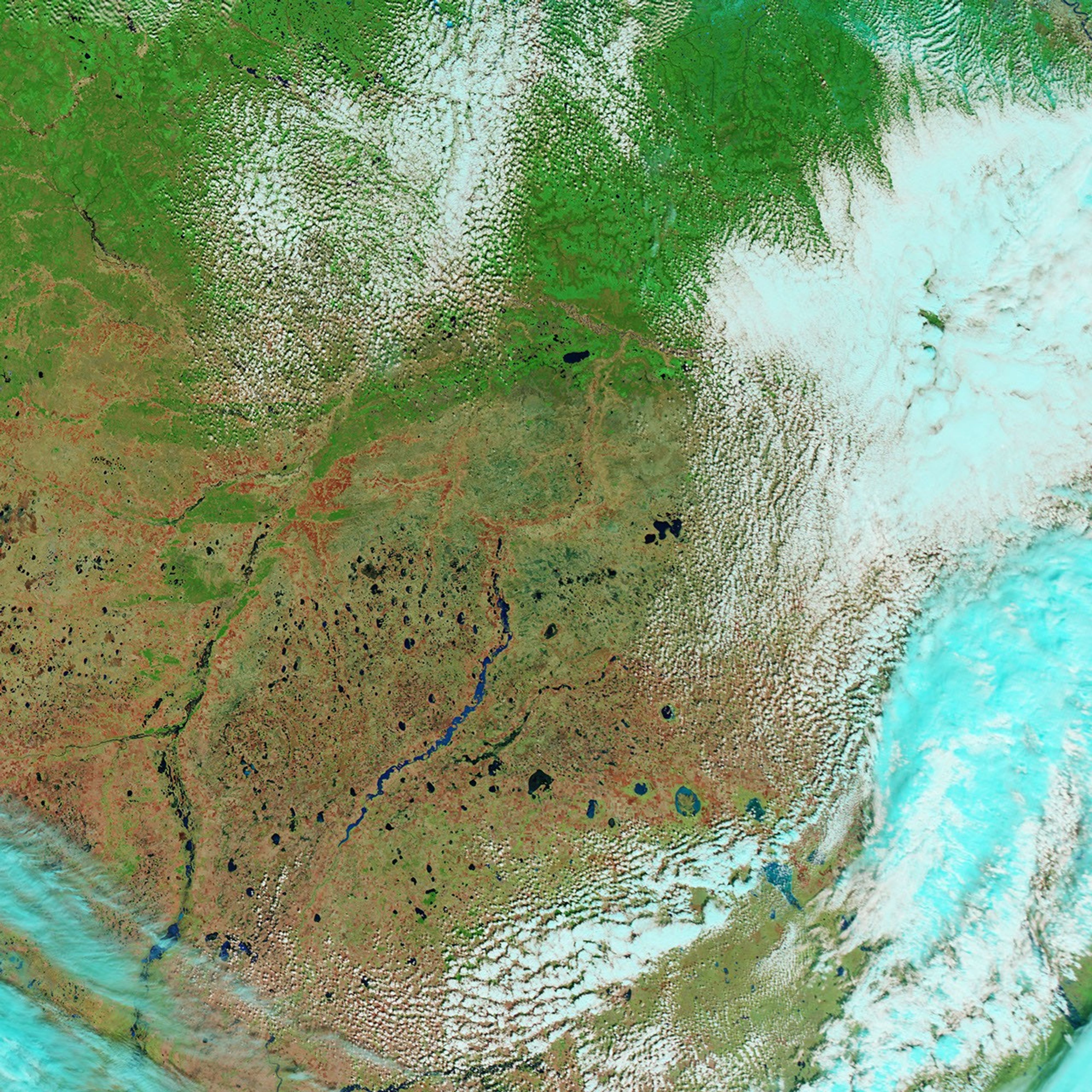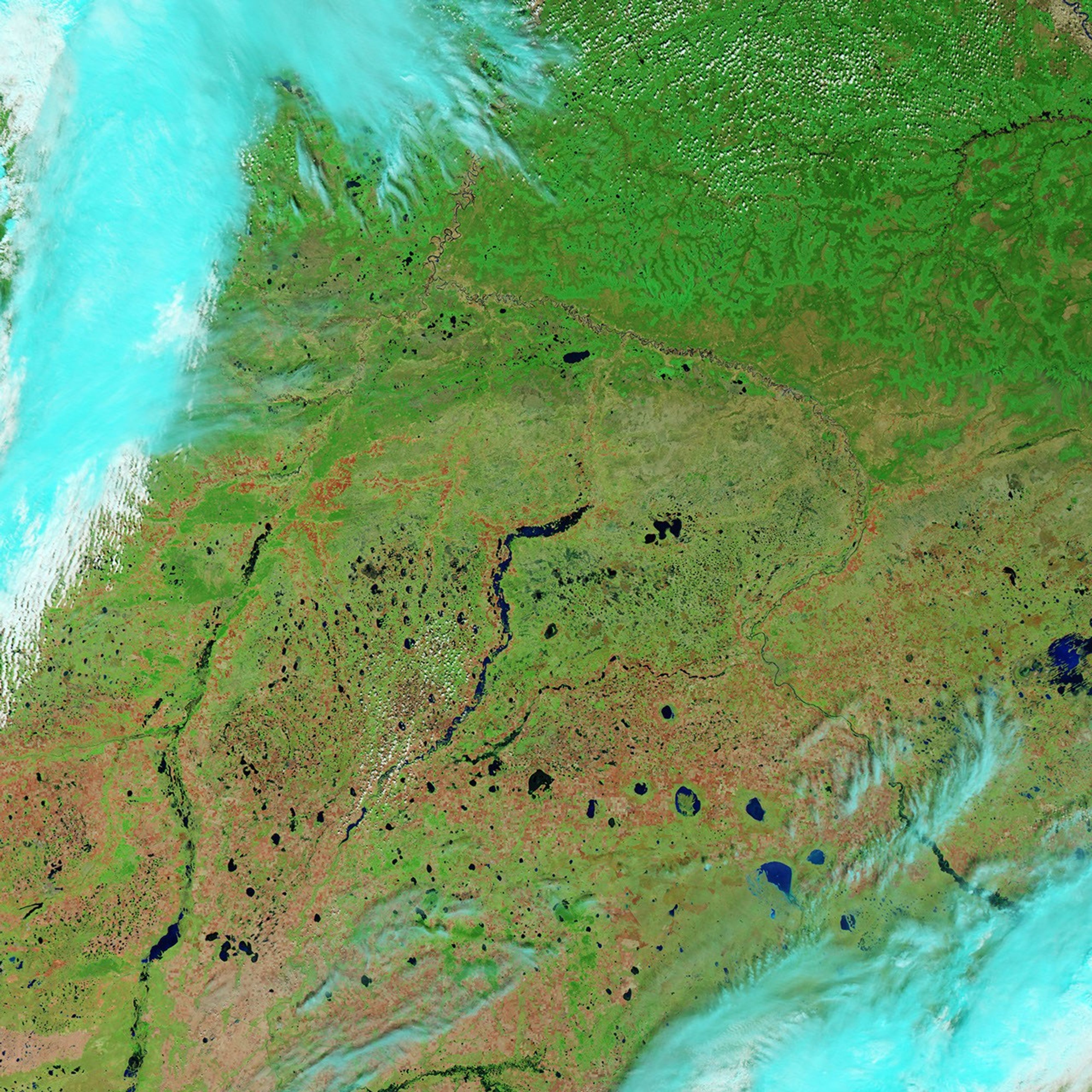 The Moderate Resolution Imaging Spectroradiometer (MODIS) on NASA’s Terra satellite captured these false-color images of the area on April 30, 2017, before the river swelled, and on May 13, 2017, as it was flooding. The images combine visible and infrared light using MODIS bands 7-2-1. These wavelengths are good for cutting through haze, revealing water amid land, and showing vegetation and burnt area. Water appears deep blue, vegetated areas are green, and bare ground is brown.