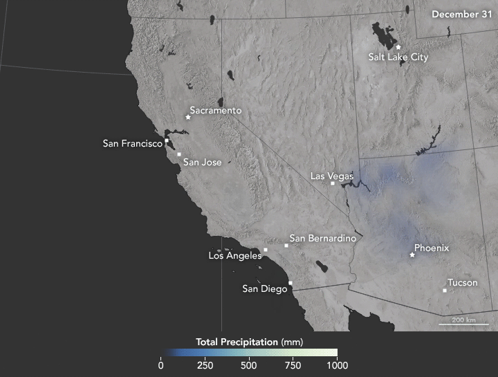 The map below shows satellite-based measurements of rain, snow, and other wintry precipitation as it has accumulated over California, Nevada, Utah, and Arizona this year. Specifically, it adds the daily precipitation totals from December 31, 2016, to the evening of February 20, 2017. (You can download an animation of this accumulation via the link below the image.) These are remotely-sensed estimates, and local amounts can be significantly higher when measured from the ground. The brightest areas on the map depict as much as 1000 millimeters of precipitation, or 39.37 inches.