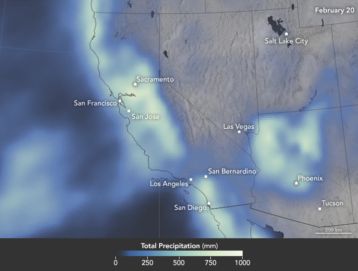 The map below shows satellite-based measurements of rain, snow, and other wintry precipitation as it has accumulated over California, Nevada, Utah, and Arizona this year. Specifically, it adds the daily precipitation totals from December 31, 2016, to the evening of February 20, 2017. (You can download an animation of this accumulation via the link below the image.) These are remotely-sensed estimates, and local amounts can be significantly higher when measured from the ground. The brightest areas on the map depict as much as 1000 millimeters of precipitation, or 39.37 inches.