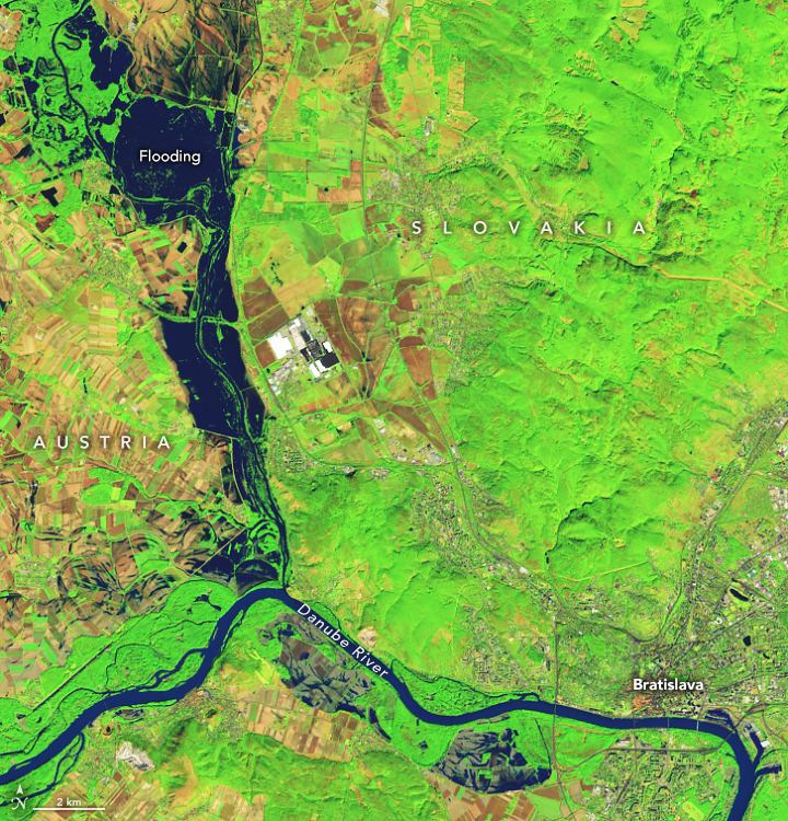 The Danube River overtopped its banks in Slovakia, sending floodwaters into the capital, Bratislava. The false-color image below, acquired by the OLI-2 on Landsat 9, shows inundated areas along the Danube on September 21. According to news reports, the relentless rain forced dozens of people from their homes.