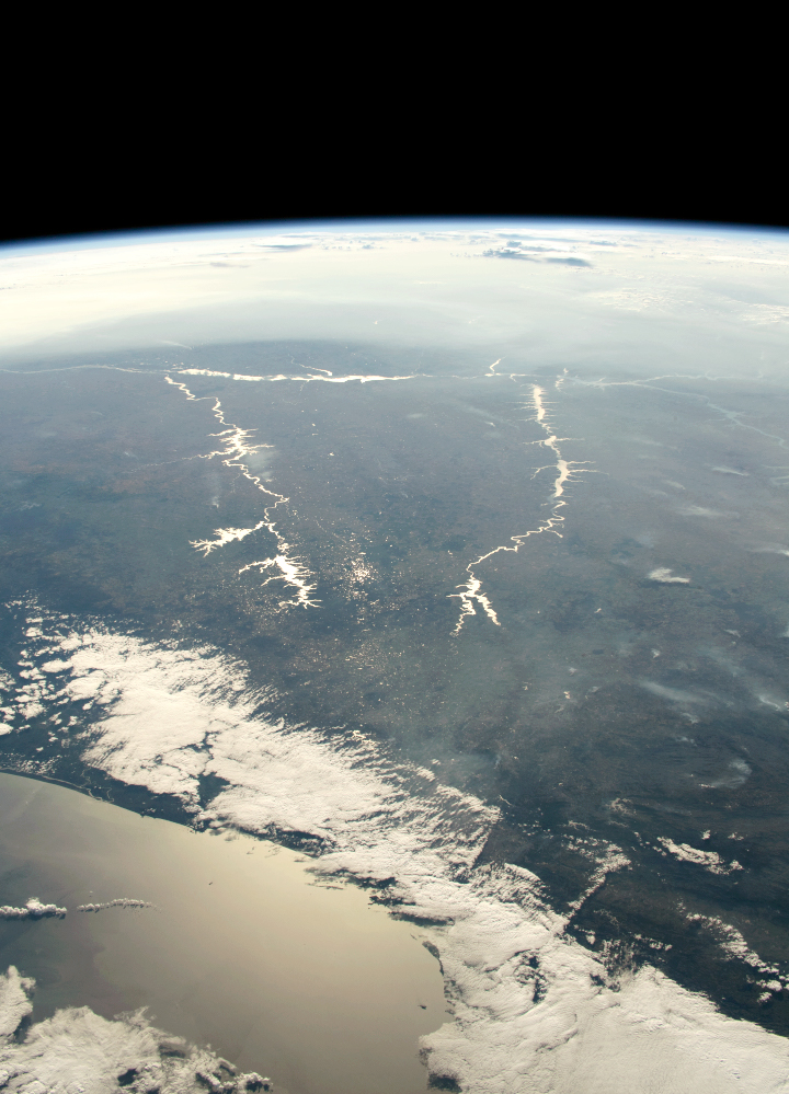 An astronaut aboard the International Space Station (ISS) focused a long camera lens on the Sun’s reflection point while orbiting over southern coastal Brazil. That reflection (known as sunglint) highlights three major rivers: Rio Paraná, Rio Tietê, and Rio Paranapanema.