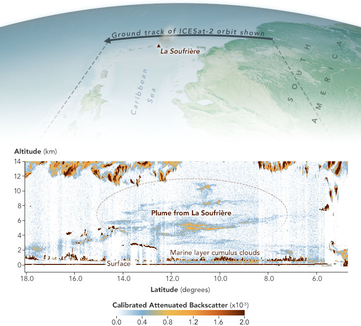 The data visualization above offers a view of the vertical distribution of ash in the atmosphere over the Atlantic Ocean about 300 kilometers (200 miles) downwind from La Soufriére. The data were collected on April 12, 2021, by the Advanced Topographic Laser Altimeter System (ATLAS) on NASA’s ICESat-2. Note that much of the ash lingered at heights ranging from 4 to 10 kilometers.