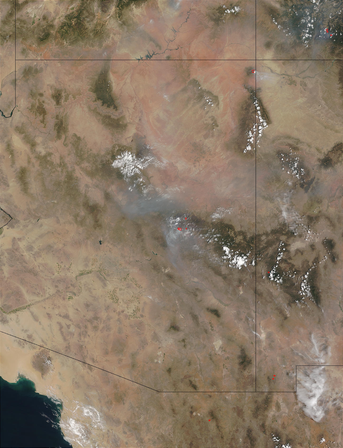 The Rodeo-Chediski Fire in east-central Arizona had grown to over 463,000 acres as of Monday, July 1, 2002. The fire is about 45 percent contained, and many evacuees have been allowed to return to their homes; however, the danger is still high. Most of the containment lines constructed so far are holding. True- and false-color images from the Moderate Resolution Imaging Spectroradiometer (MODIS) were captured on June 30. The true-color image on the left shows the thick smoke that billows from the fire, while the false-color image on the right shows the burned area. Vegetation is bright green, fire detection pixels are bright red, and the burned areas are reddish-brown.