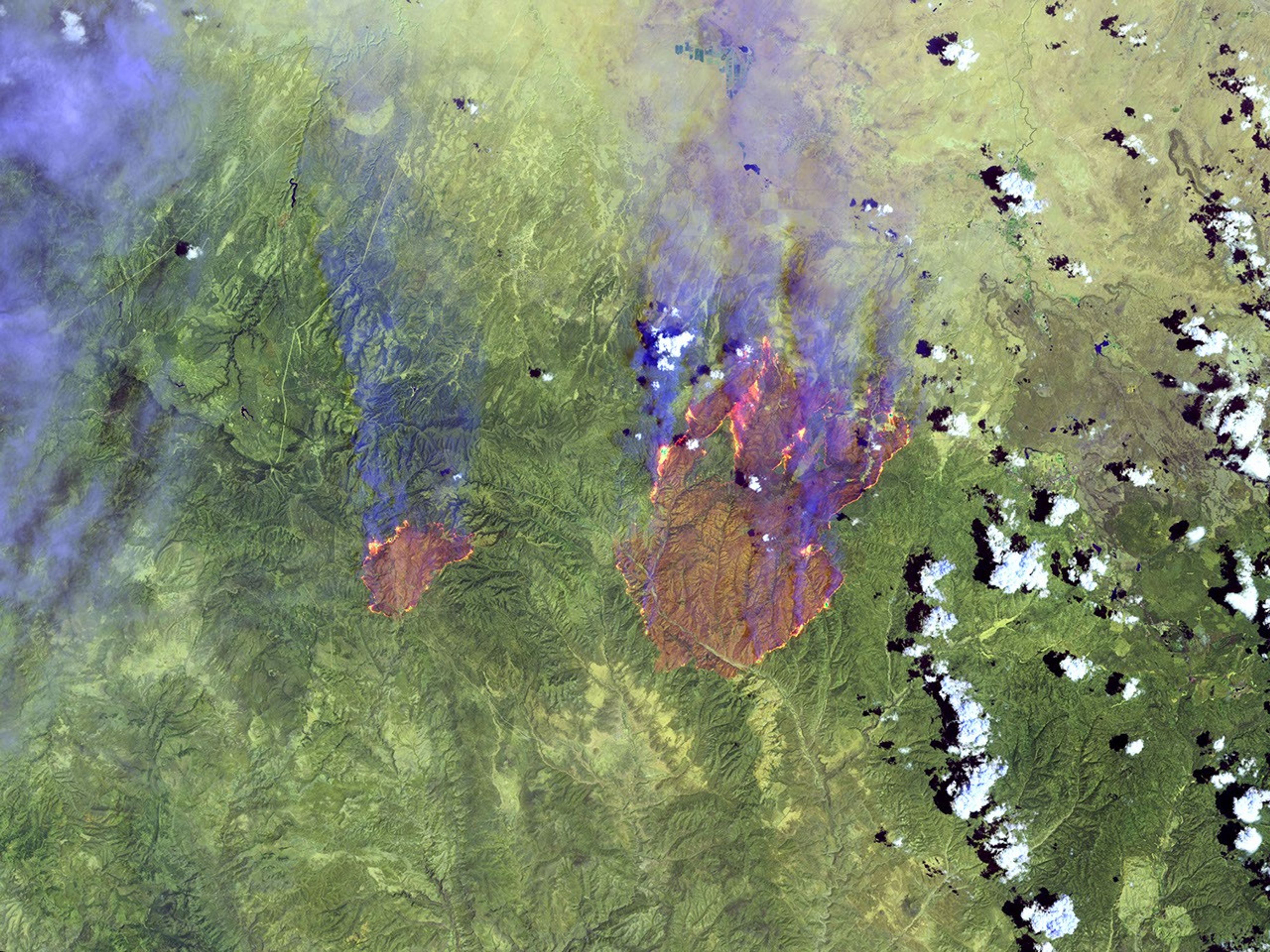 On June 21, 2002, the Rodeo and Chediski Fires in east-central Arizona were still two separate fires. This false-color (shortwave infrared, near infrared, and green as red, green, and blue, respectively) scene from the Enhanced Thematic Mapper Plus (ETM+) aboard the Landsat 7 satellite shows the active perimeter of the fires in yellow and vegetation in green. Burned areas appear pinkish-green, and smoke is blue. In this image, the smaller Chediski Fire is on the left, and the Rodeo Fire is on the right. At least one of the fires was caused by an arsonist.